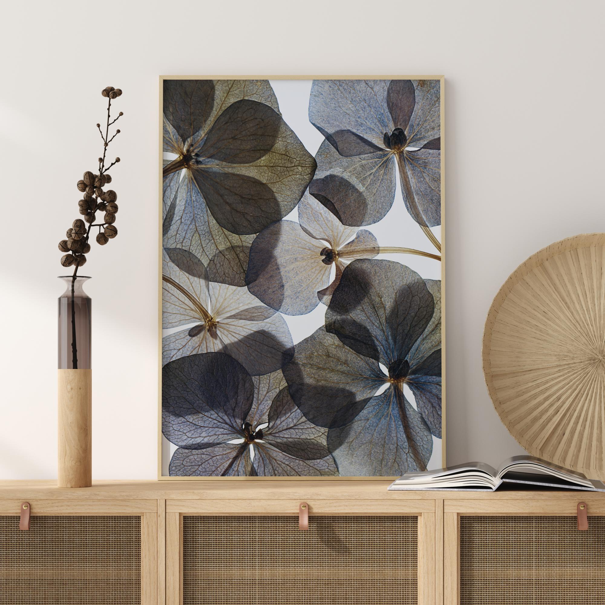 Un poster botanico pieno di fiori trasparenti blu e marroni. La luce bianca dello sfondo brilla attraverso questi petali, alcuni dei quali si sovrappongono rendendoli più scuri. Appendi questa opera e immagina di trovarti sotto questi fantastici e ampi petali per essere circondato da un'atmosfera tranquilla.