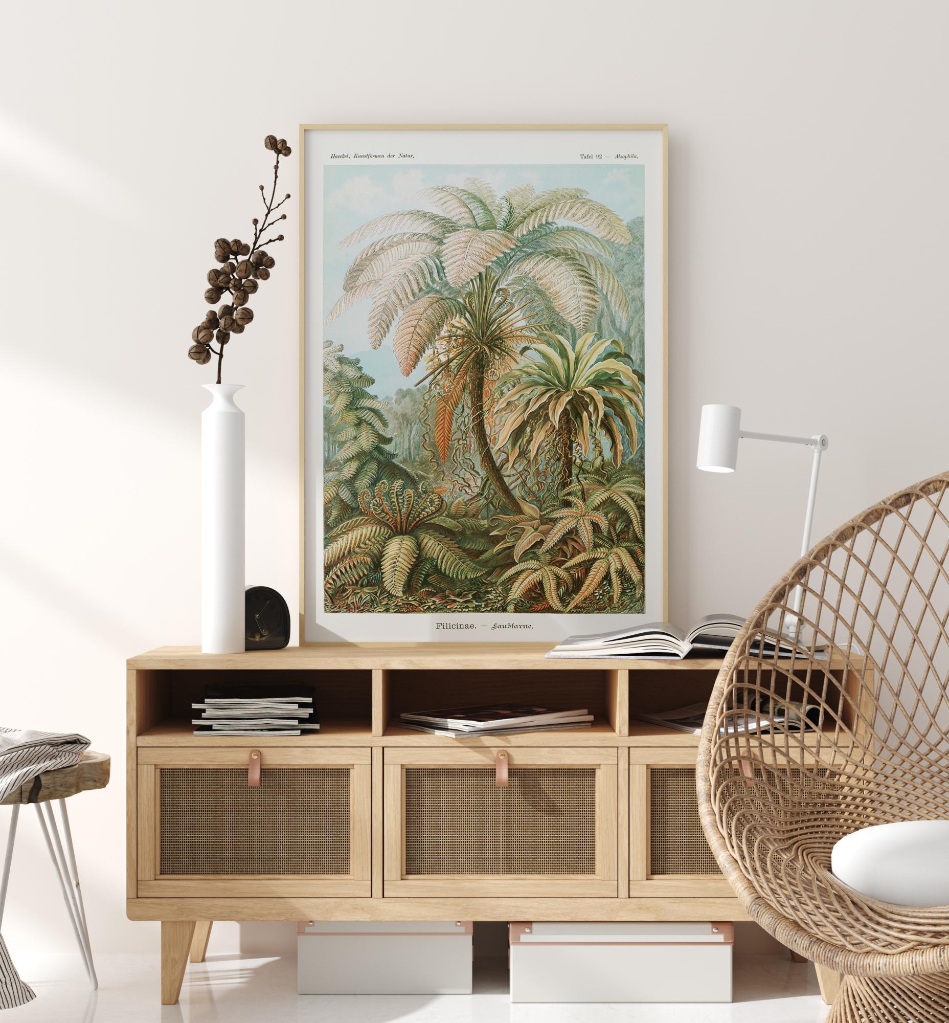 Un poster botanico con diverse piante. Grandi foglie di palma e felci coprono l'intera immagine. Il verde, il blu e l'arancione creano tonalità morbide in questo antico disegno scientifico tedesco. Dai alla tua casa un tocco di storia utilizzando queste piante e i loro nomi latini.