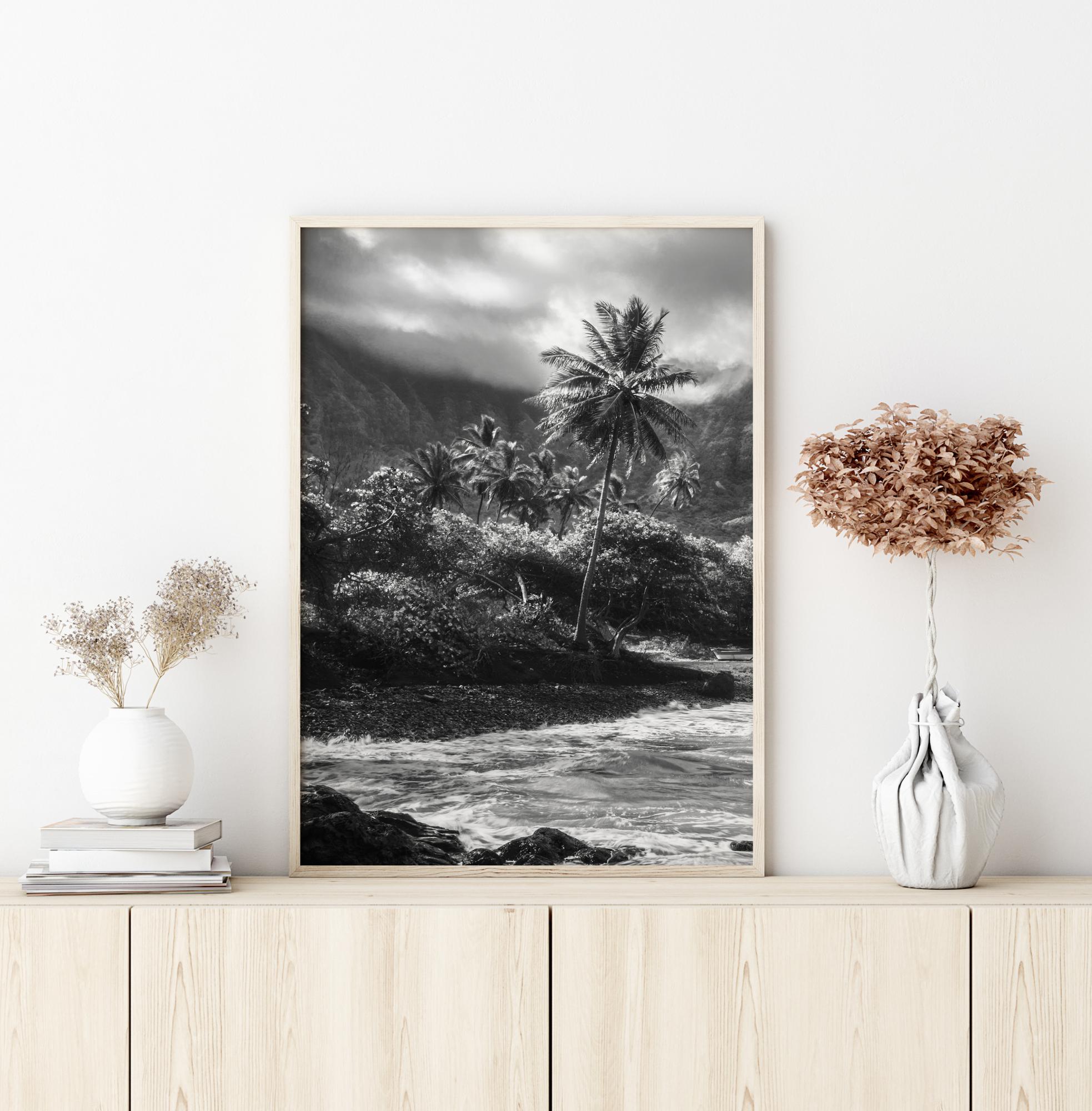 Un poster naturalistico con una tempesta imminente dove il mare incontra la terra. Un cielo nuvoloso fa ombra alla foto mentre le palme si agitano al vento. Un mare schiumoso si infrange sulla spiaggia rocciosa per un effetto extra. Crea un po' di drammaticità in casa con questa opera in bianco e nero su una parete neutra.