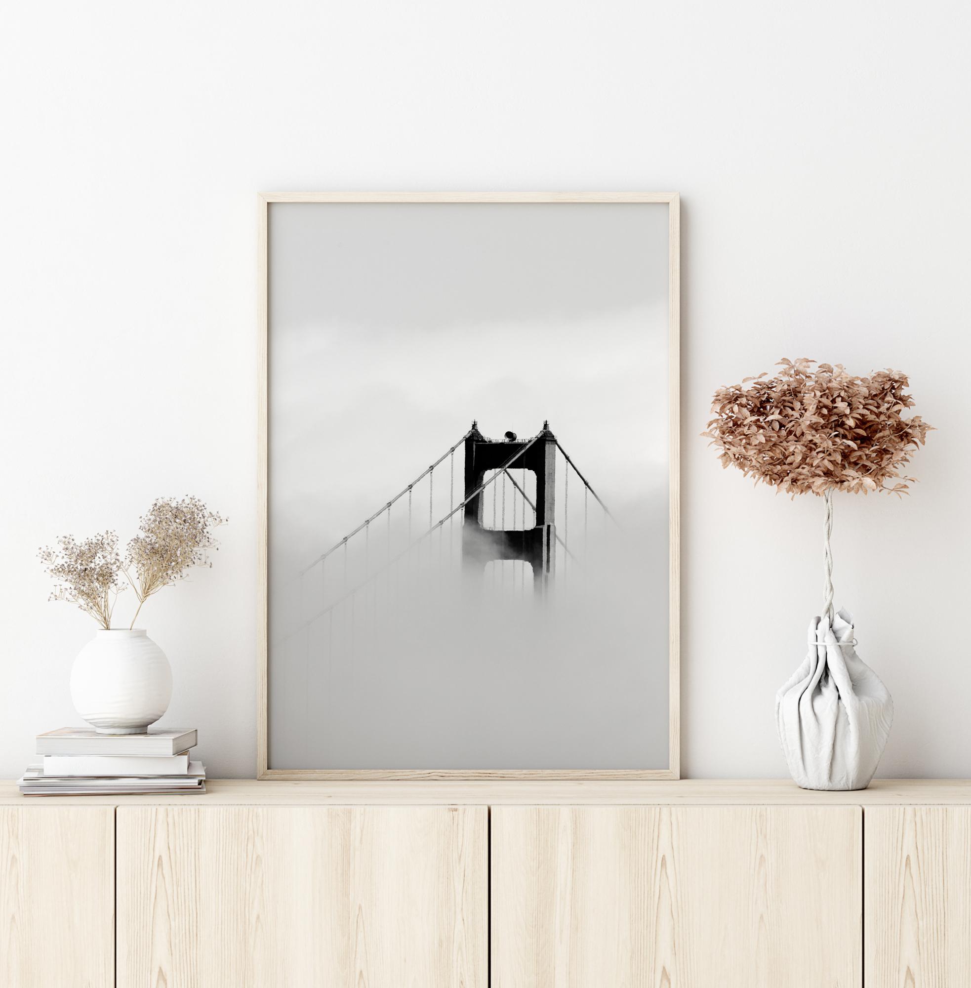 Un poster drammatico con la cima di un ponte. La nebbia si alza e nasconde l'intero ponte tranne la cima. Nero e solido, il ponte si erge tra il cielo nuvoloso sopra e la nebbia sotto. Goditi questa fantastica immagine quando hai questo poster appeso al muro.
