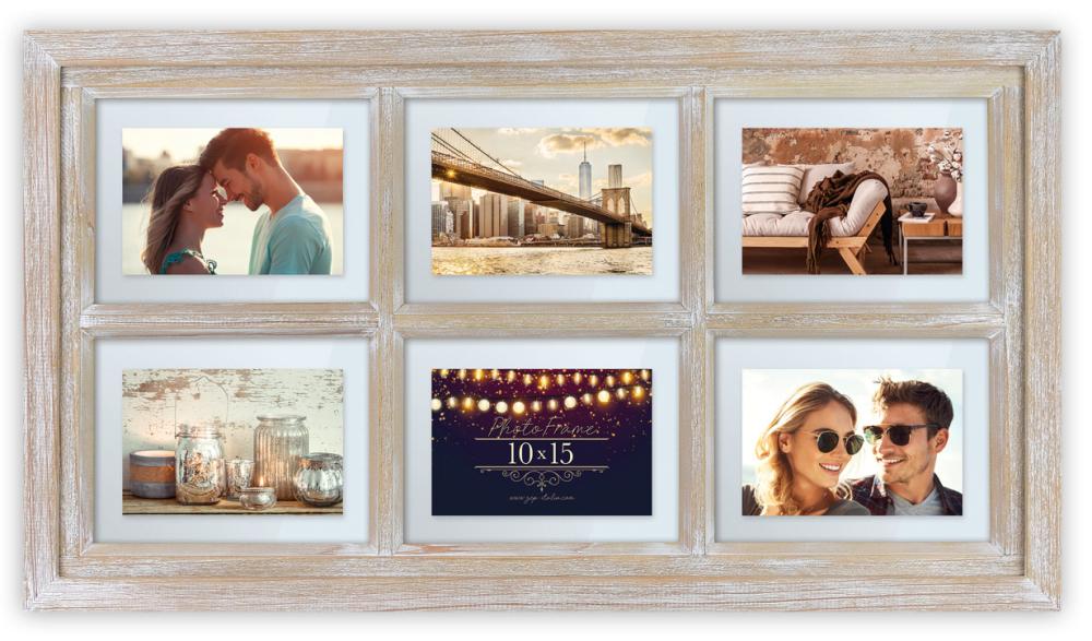 cornice multipla orizzontale in legno chiaro. Questa cornice può contenere 6 foto di dimensioni 10x15 cm e ti permette di organizzare facilmente un gruppo di immagini in modo elegante. La cornice ha delle leggere texture in legno che le conferiscono un carattere rustico e rurale. Le dimensioni esterne della cornice sono 38,5x69,5 cm. Supporto da parete incluso.