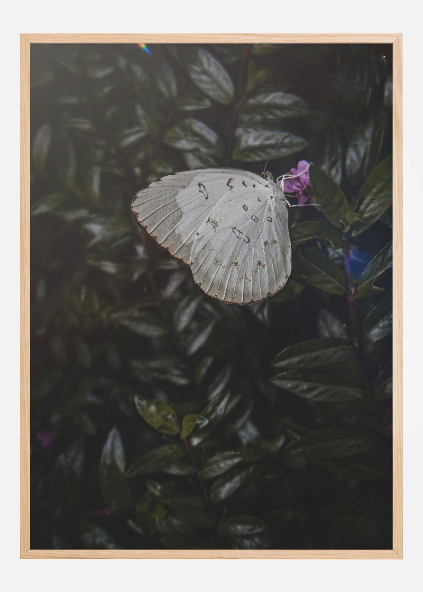 Scopri la bellezza silenziosa della natura attraverso questo poster riflessivo che ritrae una delicata farfalla a riposo. È elegantemente posizionata su uno sfondo lussureggiante di foglie verde scuro, e le sue ali bianco pallido con motivi sottili di grigio e nero ne evidenziano la fragilità e la grazia. Questa immagine è un pacifico promemoria dei momenti fugaci e incantevoli della natura.