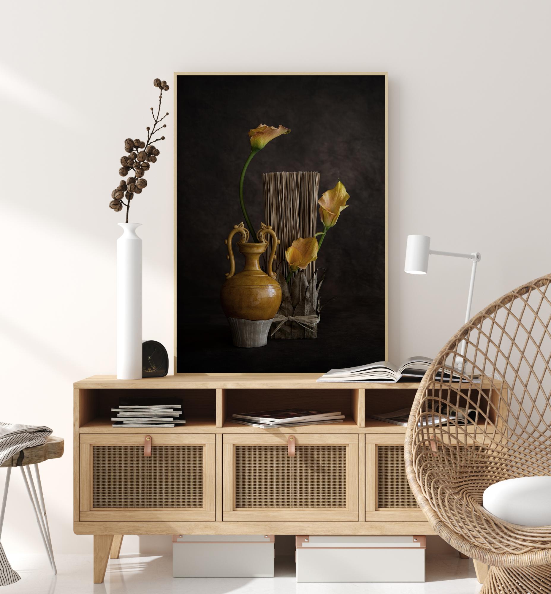 Un poster di natura morta con una brocca, steli marroni secchi e tre fiori di giglio. Uno sfondo nero fa risaltare la brocca color senape e i tre gigli gialli. Un giglio si piega verso l'alto attirando l'attenzione sull'opera. Appendilo per aggiungere un tocco di eleganza alla tua casa.