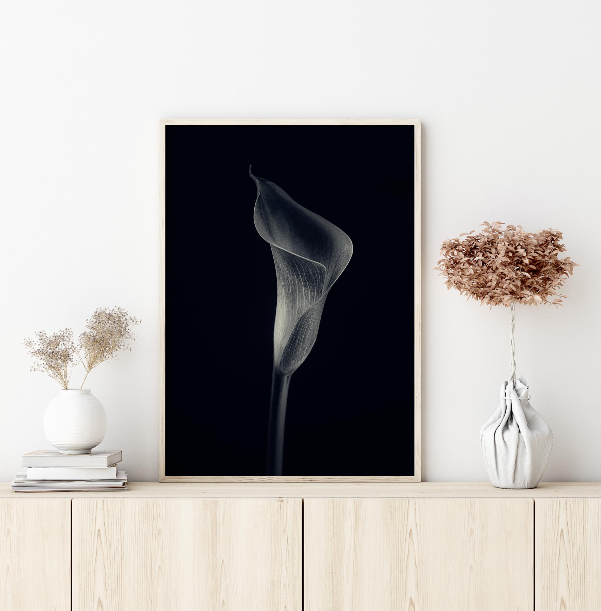 Un poster con un unico giglio che crea una luce eterea. Un negativo invertito di questo giglio conferisce al fiore un mistero sullo sfondo nero. Questa foto insolita diventa un argomento di conversazione quando viene appesa su una parete bianca per aumentare l'effetto drammatico.