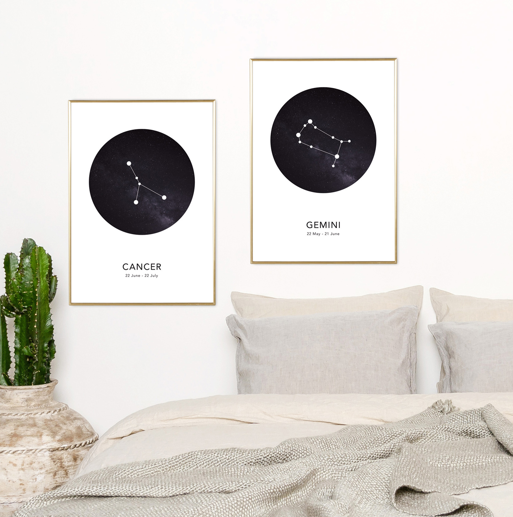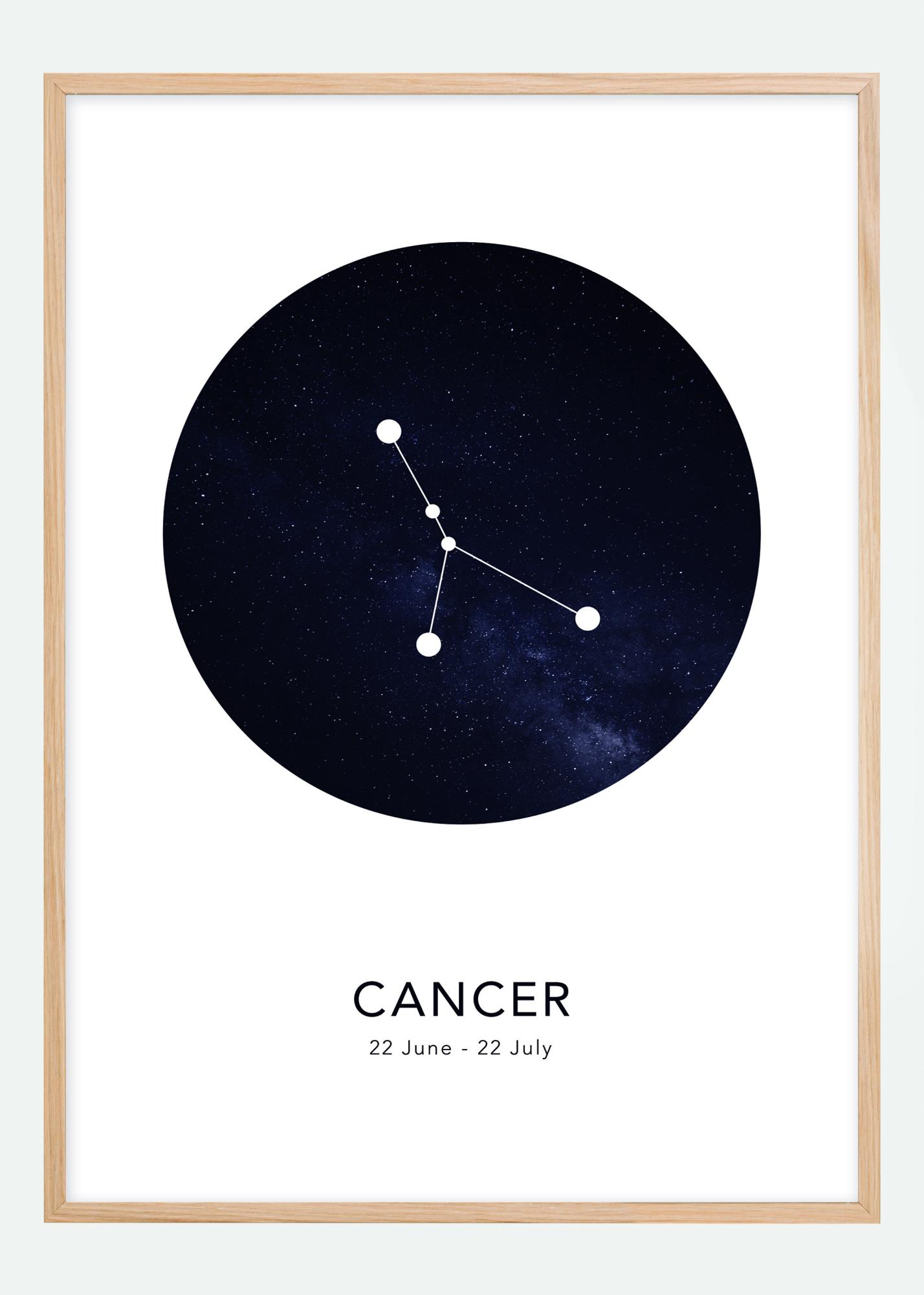 Regala un poster personalizzato a qualcuno che ami! Questo elegante poster ha un motivo del segno zodiacale del Cancro su uno sfondo di cielo stellato nero e blu. Sotto c'è il nome insieme alla data corrente in inglese.