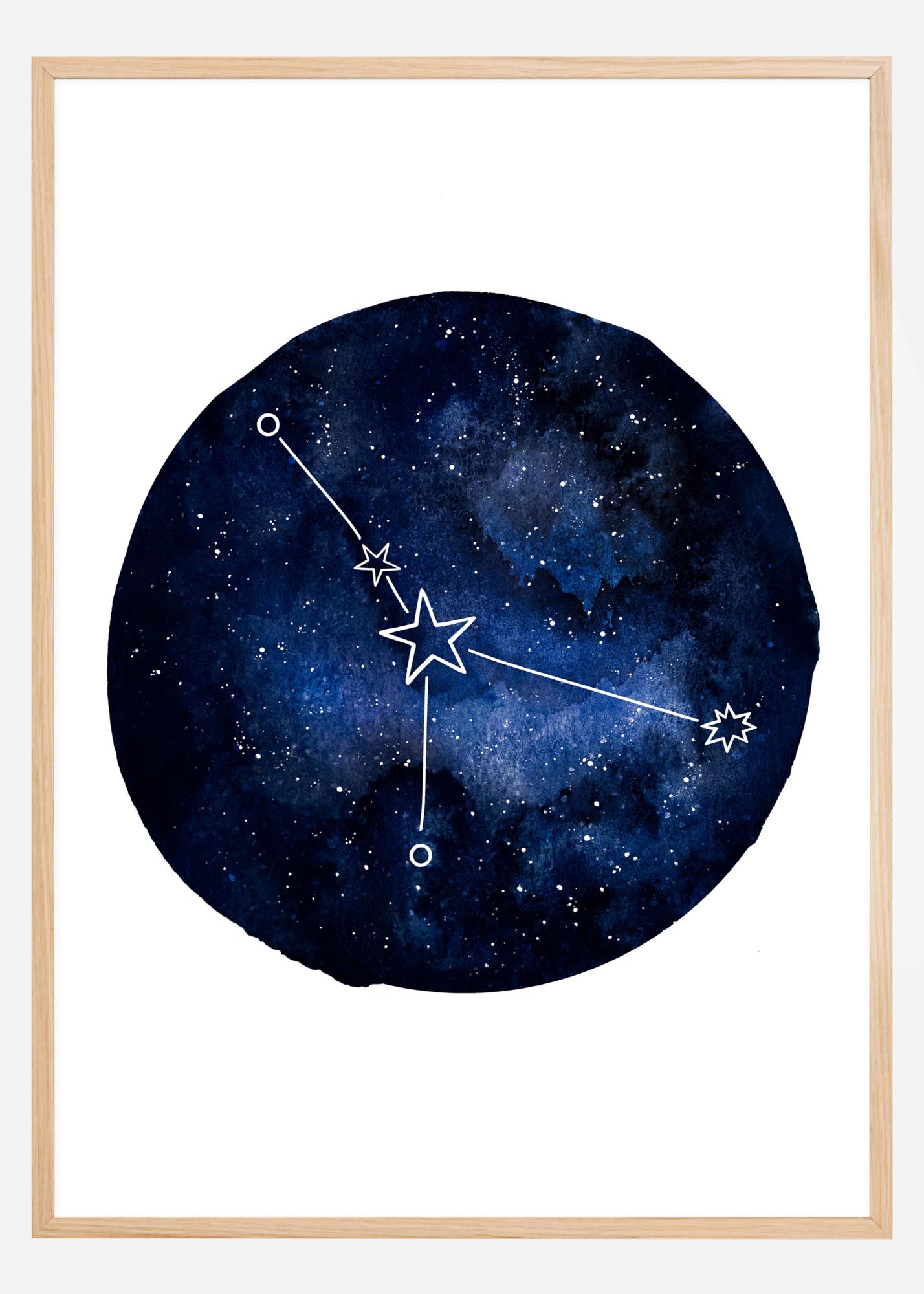 Un poster dell'oroscopo con il Cancro. Un cerchio blu scuro riempie il centro di questa immagine bianca. Nel cerchio ci sono diverse tonalità di blu e diverse stelle. Il segno zodiacale del Cancro è prominente al centro. Se ami il tuo segno zodiacale, questa immagine è un must per la tua parete.