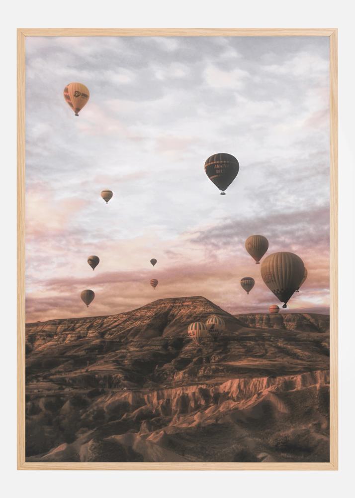 Un poster paesaggistico magico di Cappadocia con mongolfiere che volano nel cielo blu. Le morbide rocce rosa sono illuminate da un sole invisibile che conferisce anche un bagliore rosato al cielo nuvoloso. Le mongolfiere a aria calda fluttuano verso l'alto. Ottieni una sensazione di sollevamento quando questo è appeso a una parete di casa.