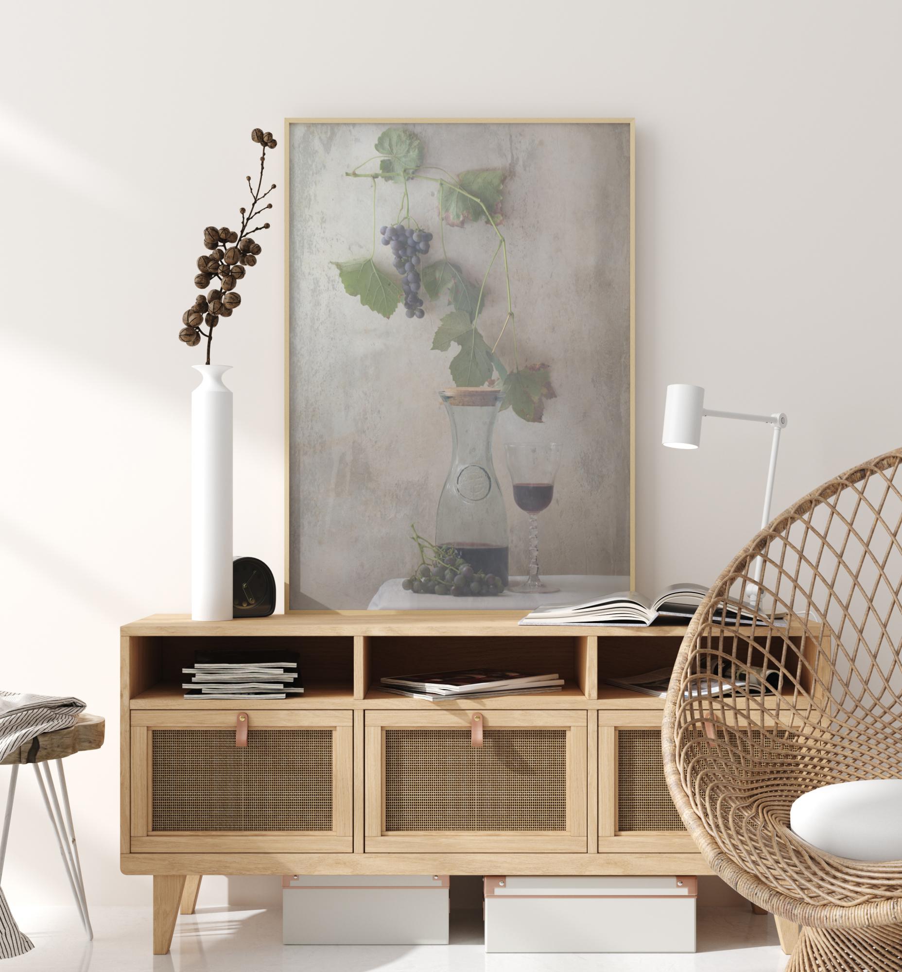 Un poster di natura morta con una caraffa di vino fatto in casa, un bicchiere di vino e un piccolo rametto di uva. Le uve di colore viola scuro e le foglie verdi sono appese a una semplice parete grigia, che le fa risaltare. Trasportati in una villa romana quando hai questo elegante ma semplice lavoro appeso in casa.