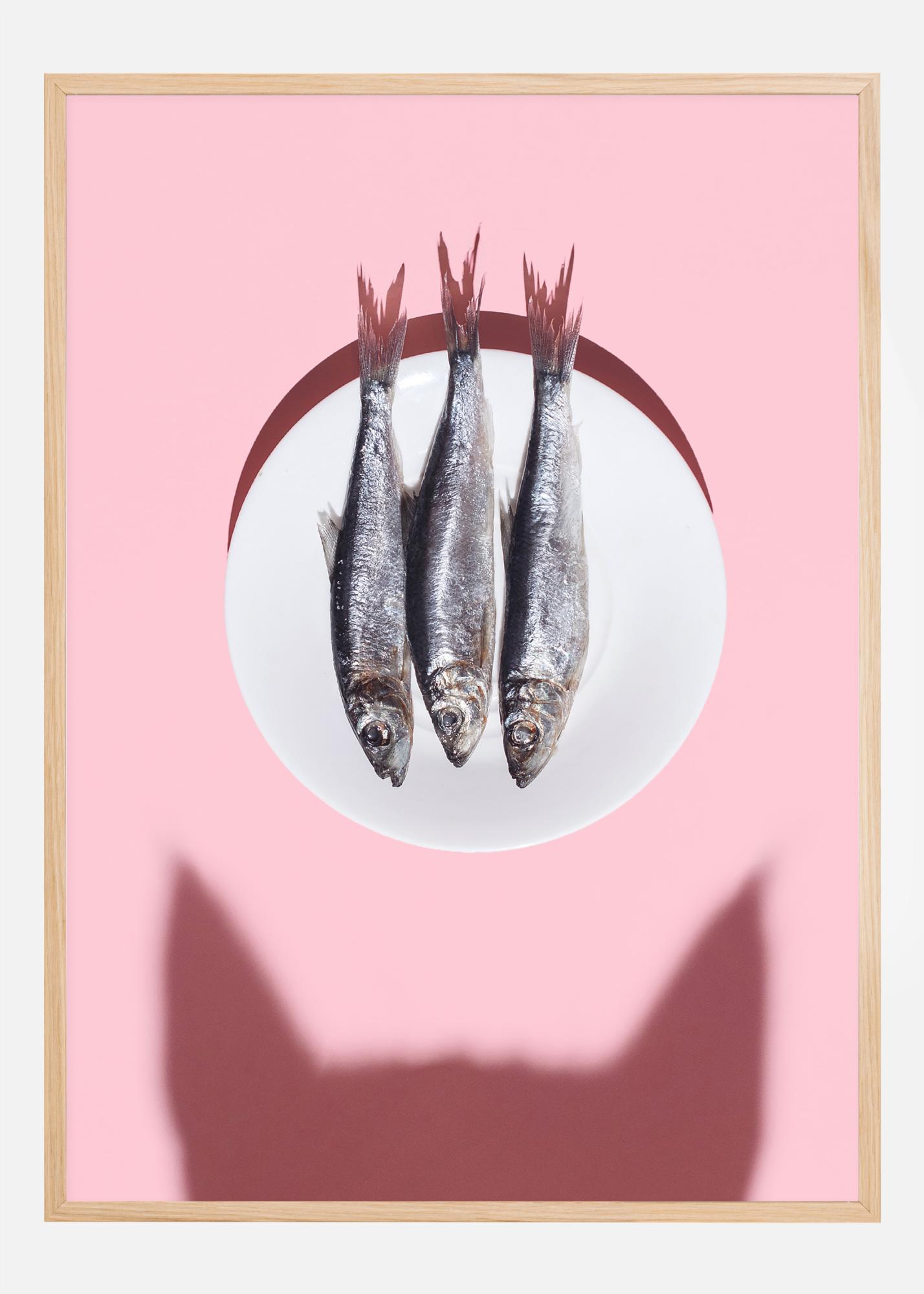 I colori dominanti in questa stampa sono uno sfondo rosa pastello che armonizza con il bianco del piatto e il grigio argenteo dei pesci, che rafforza la texture e la forma degli elementi visivi. Il gioco di luci tra gli oggetti e lo sfondo cattura l'attenzione dell'osservatore e contribuisce a una sensazione dinamica nell'immagine. Questo poster non è solo un'opera d'arte per amanti del cibo e appassionati di gatti, ma anche per coloro che apprezzano la bellezza della semplicità e un sottile accenno di umorismo nel design degli interni.