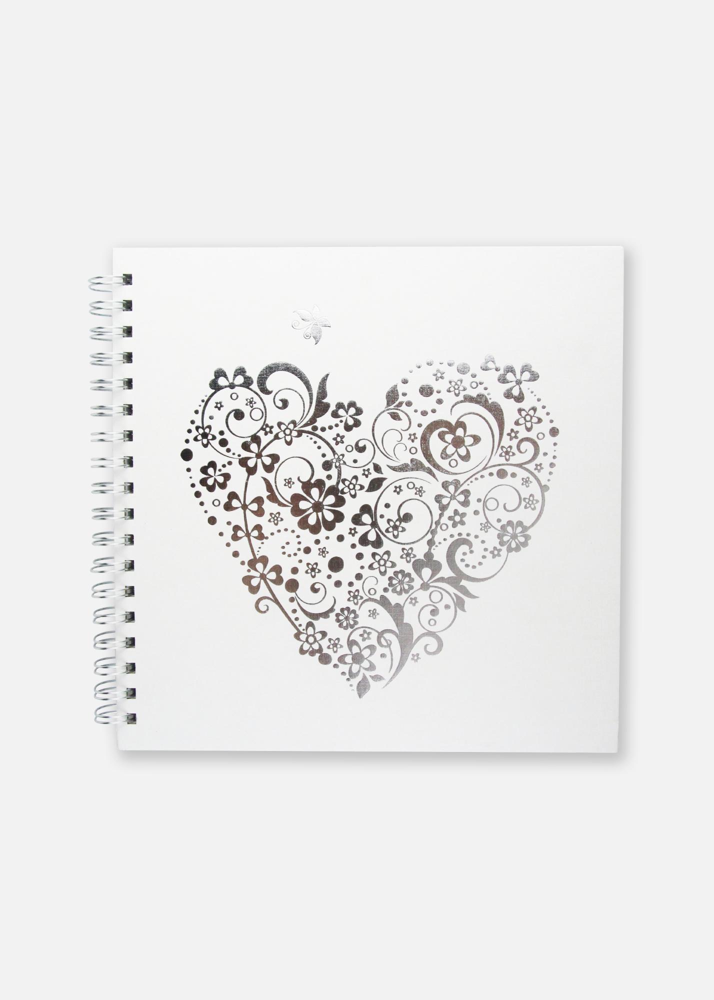 Album a spirale bianco di dimensioni 18x18 cm. Sulla copertina è stampato un cuore argentato con dettagli floreali. L'album contiene 24 pagine bianche privo di acidi ed è perfetto per essere lasciato in mostra per sfogliarlo senza occupare troppo spazio.