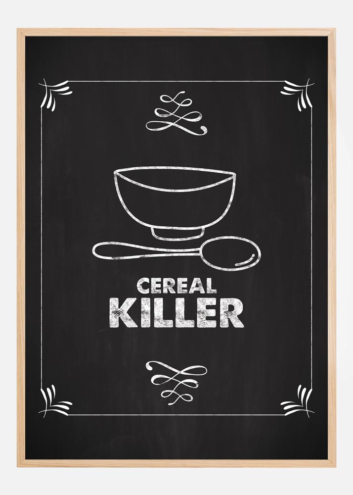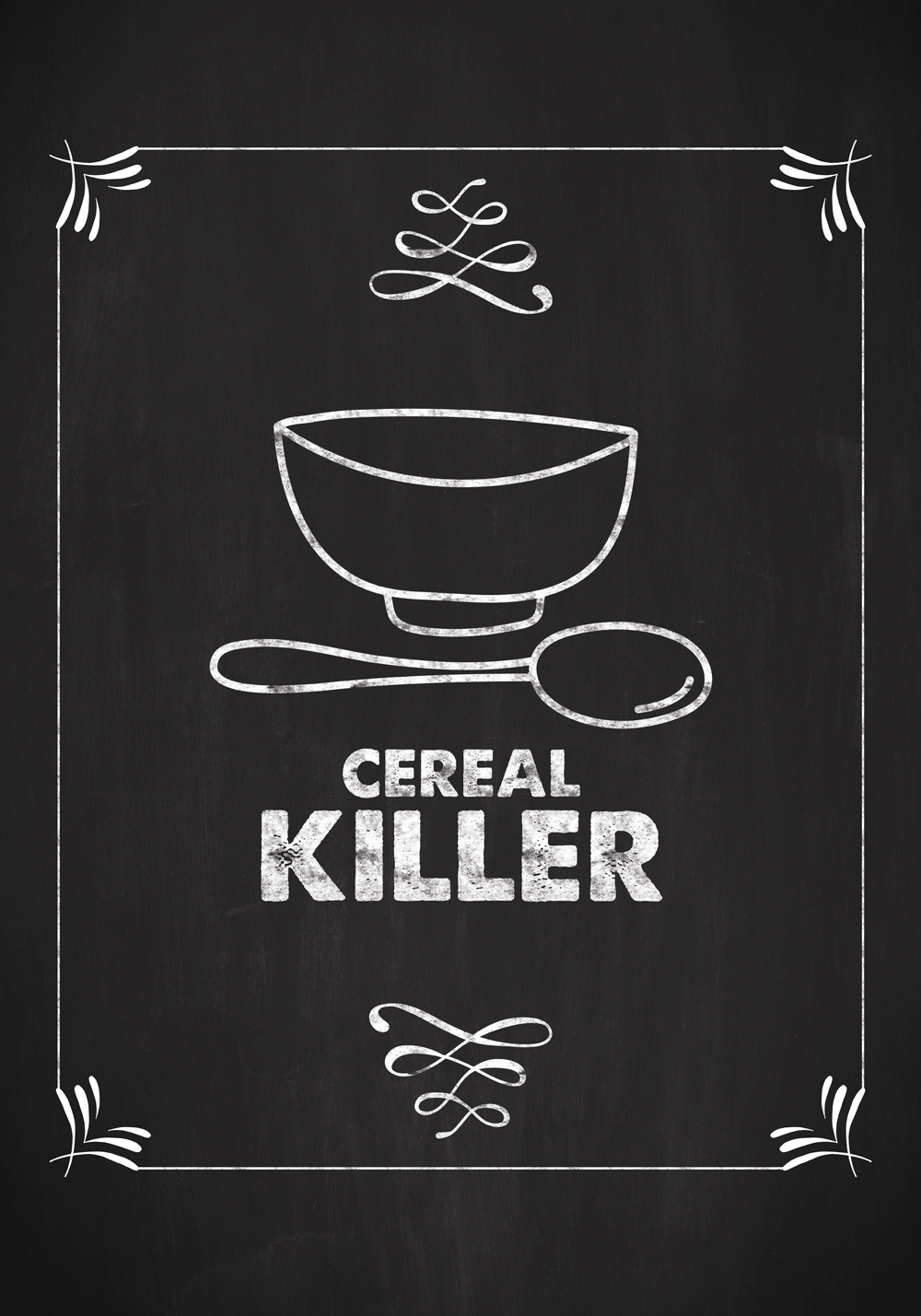 Poster da cucina con un messaggio sia spaventoso che divertente. Perfetto da regalare allo chef con un senso dell'umorismo o agli amanti dei film horror che vivono di cereali. La stampa grafica ha la sensazione di essere scritta con gessetto su una lavagna scolastica e completata con una cornice nera sottile per rafforzare questa sensazione. Il poster si adatta bene a una parete con altre immagini dal mondo della cucina.