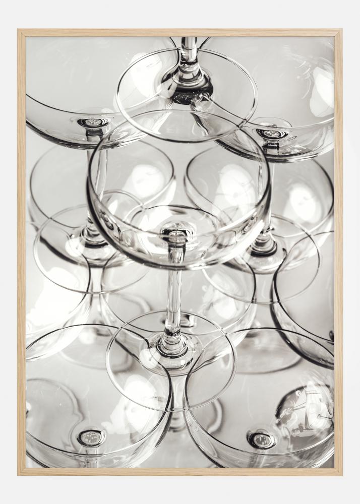 Questo elegante e sofisticato poster cattura la bellezza e la chiarezza di una cascata di coppe di champagne. L'immagine ritrae un primo piano della complessa struttura del vetro, dove la luce si riflette e si rifrange attraverso il materiale trasparente, creando una danza di luci e ombre. La ricchezza dei dettagli e la precisa delicatezza nella composizione mettono in evidenza le forme sottili del vetro e le sfumature sottili del vetro.