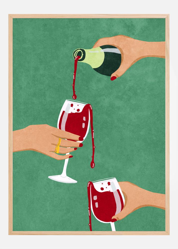 Questo poster giocoso e sofisticato cattura l'essenza dell'amicizia e della celebrazione. L'illustrazione mostra tre mani che tengono elegantemente bicchieri di vino e una bottiglia, dove un flusso di vino rosso viene appena versato in uno dei bicchieri. Questa scena è un omaggio ai piccoli momenti che rendono la vita speciale ed è una scelta ideale per chi vuole aggiungere un senso di convivialità e festosità alla propria casa. La stampa è tanto un inizio di conversazione quanto un dettaglio decorativo d'arredo.