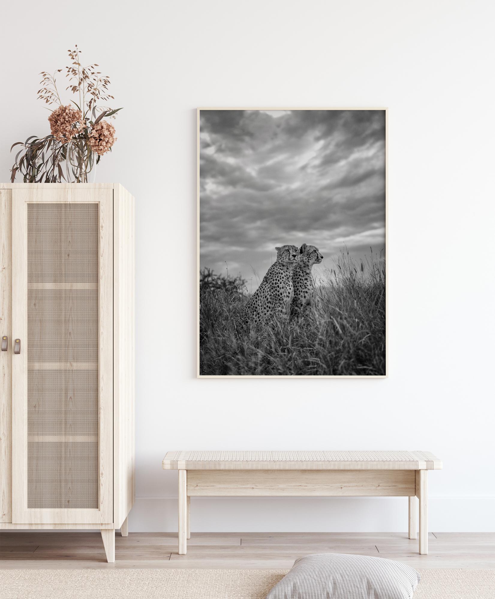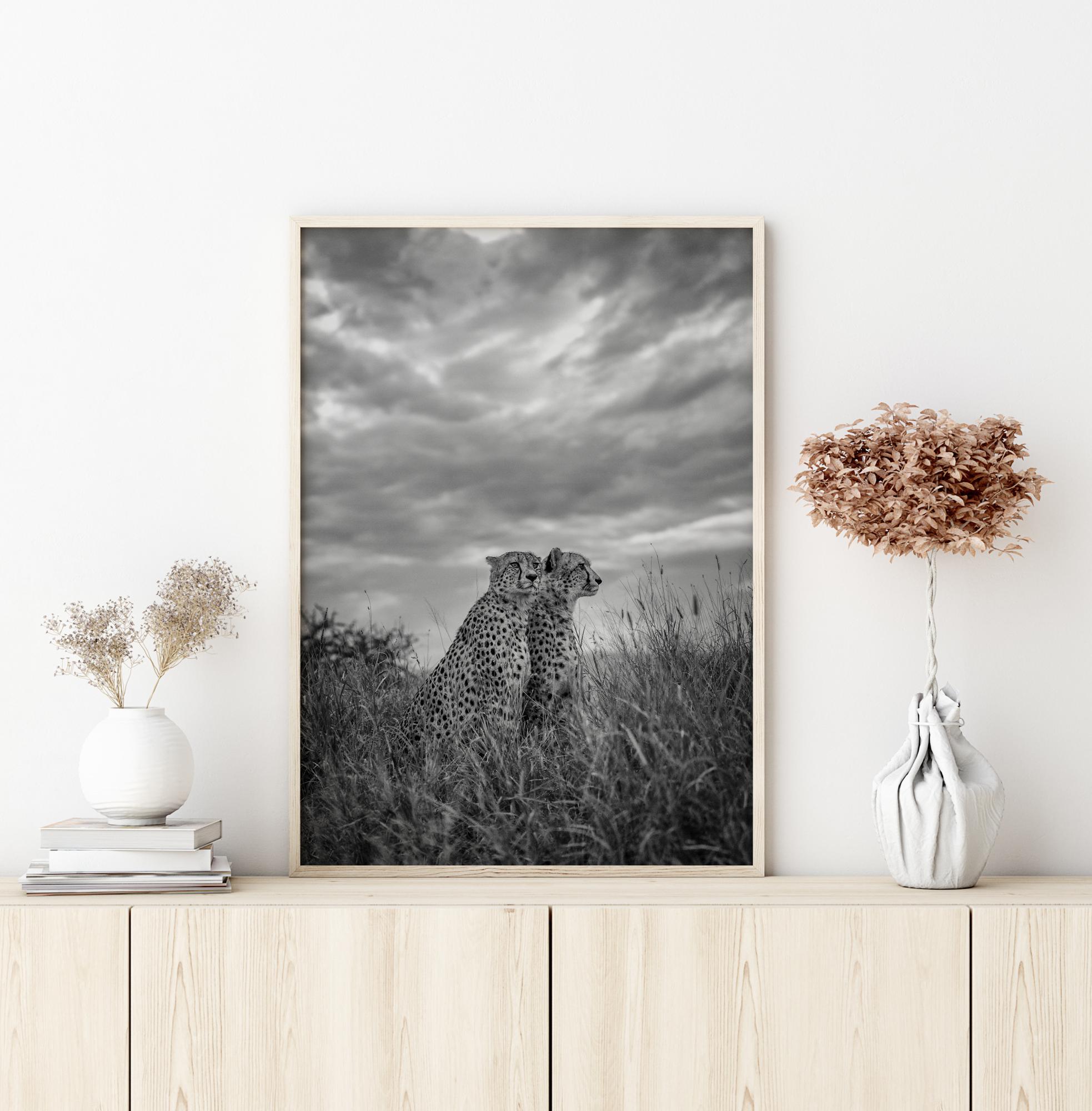 Un poster naturalistico con due ghepardi che guardano oltre le pianure africane. Il cielo nuvoloso contrasta con le fantastiche macchie di questi animali. Con questo poster puoi portare a casa la grandiosità della natura.