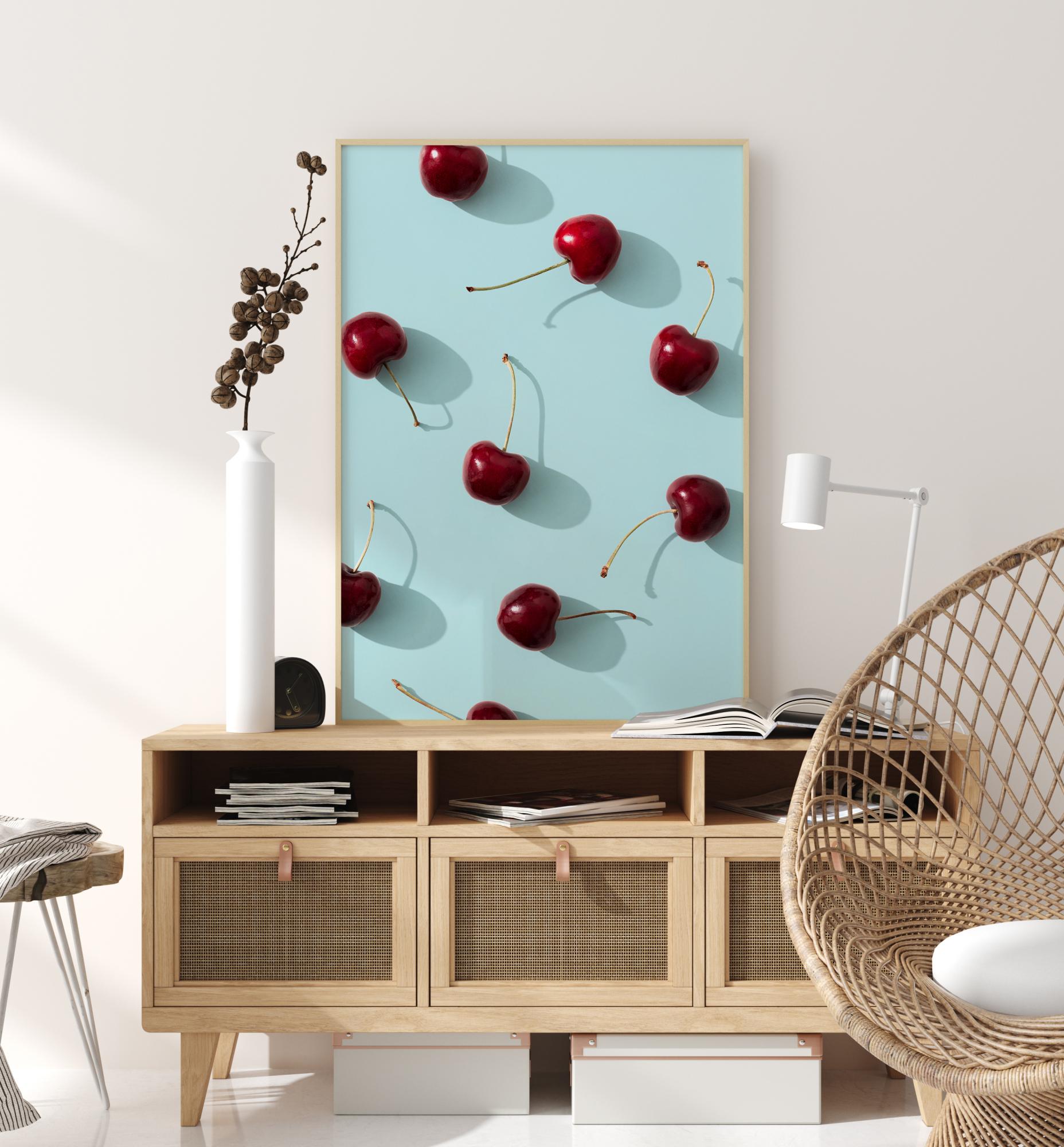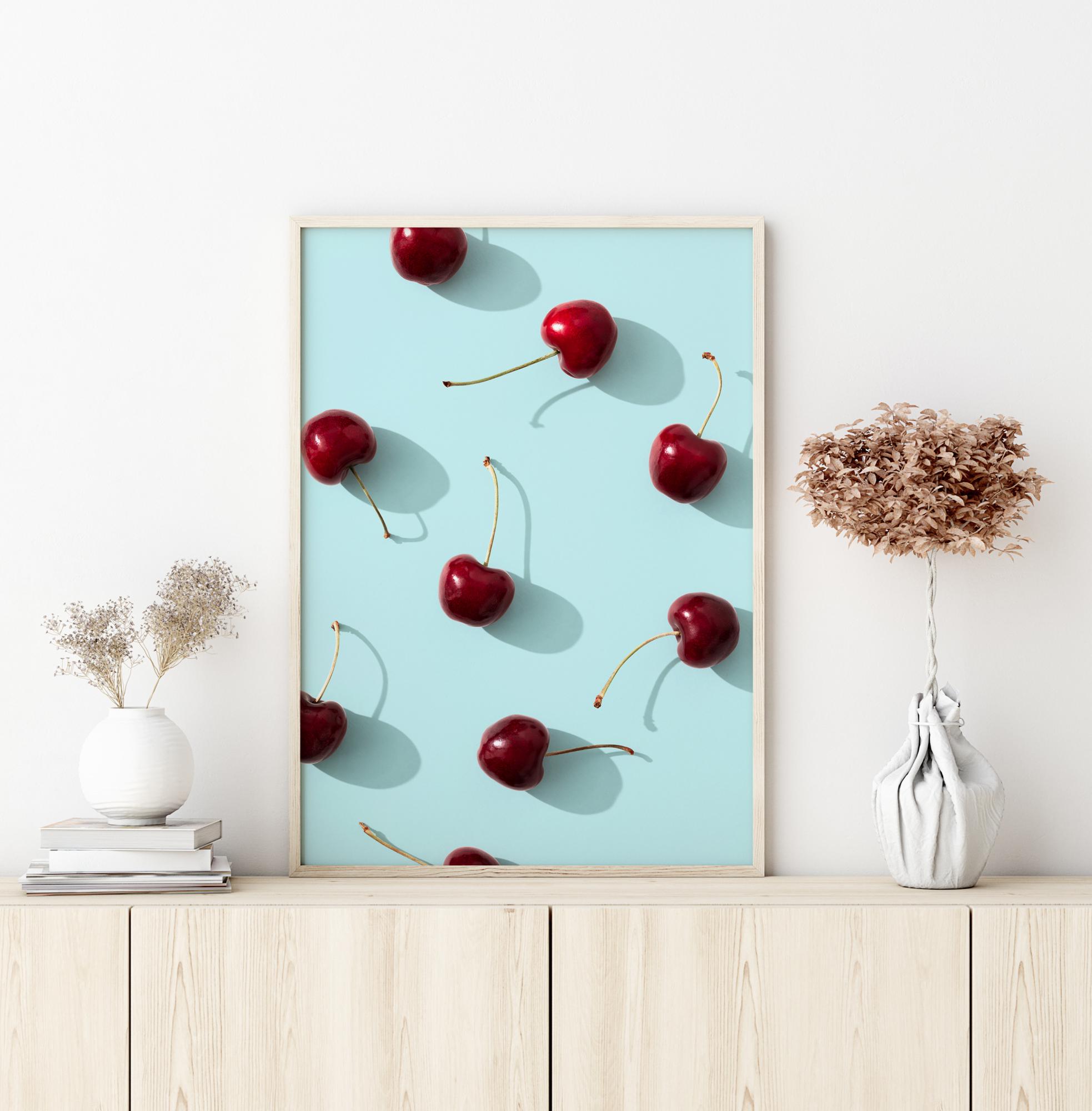 Un poster di frutta con otto ciliegie su uno sfondo blu morbido. Ciliegie rosse chiare e i loro steli proiettano ombre sul semplice piano turchese su cui sono posate. Ricordati dei tuoi cinque al giorno con questa succosa immagine appesa nella tua cucina.