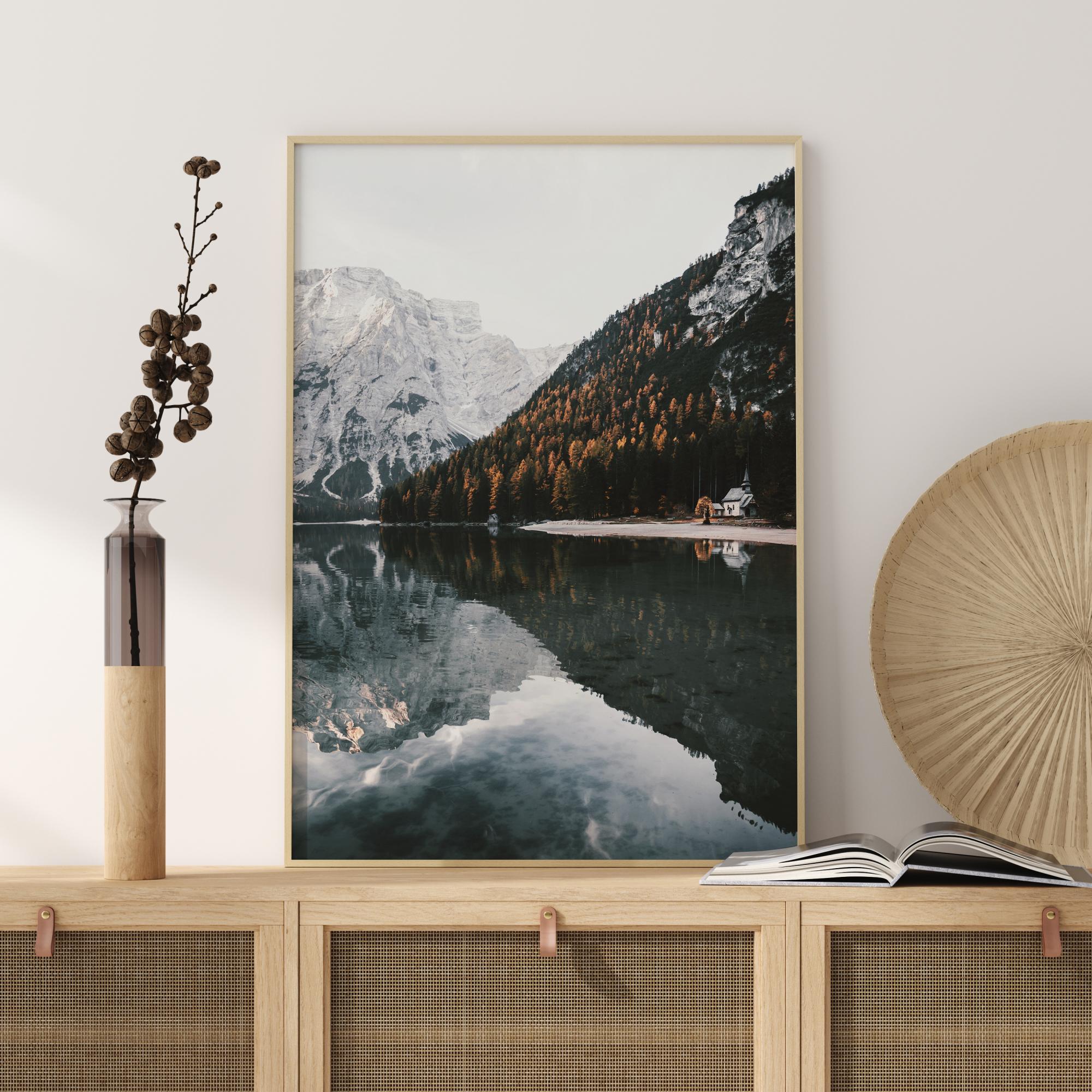 Un poster epico di un paesaggio montano con una piccola chiesa situata nella foresta. Goditi la grandezza di questo paesaggio innevato dove le montagne si riflettono nel tranquillo lago. Alberi gialli d'autunno adornano le montagne e una piccola chiesa bianca si erge ai verticale. lasciati ispirare mentre osservi le meraviglie della natura.