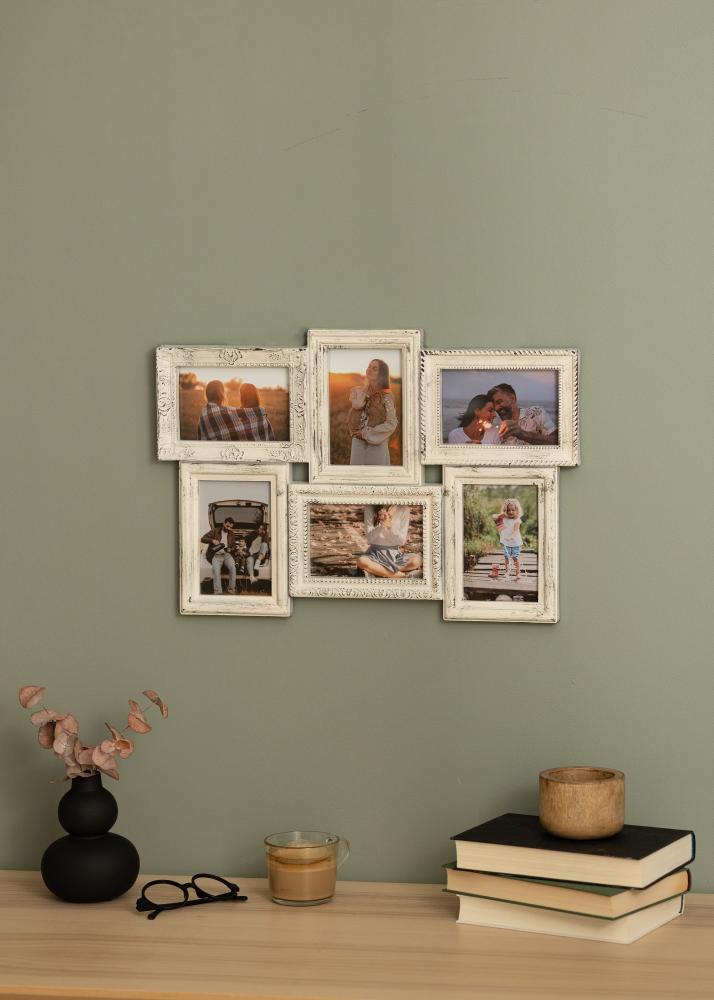 Questa cornice multipla darà un'elegante cornice a 6 delle tue foto preferite. Ha un aspetto romantico, con una tonalità color crema, una superficie consumata e bellissimi ornamenti su alcune parti del listello della cornice. Grazie ai supporti da parete sul retro della cornice, puoi facilmente montarla sulla parete della stanza che desideri.