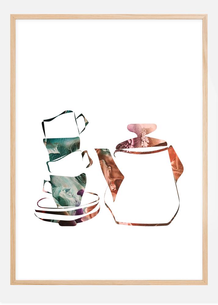 Un poster astratto con caffè e tè insieme a tazze, piatti e una teiera. Ognuno è realizzato con campi marmorizzati astratti in turchese e arancione su uno sfondo bianco. Preparati per la tua bevanda calda preferita mentre guardi questa immagine ogni mattina.