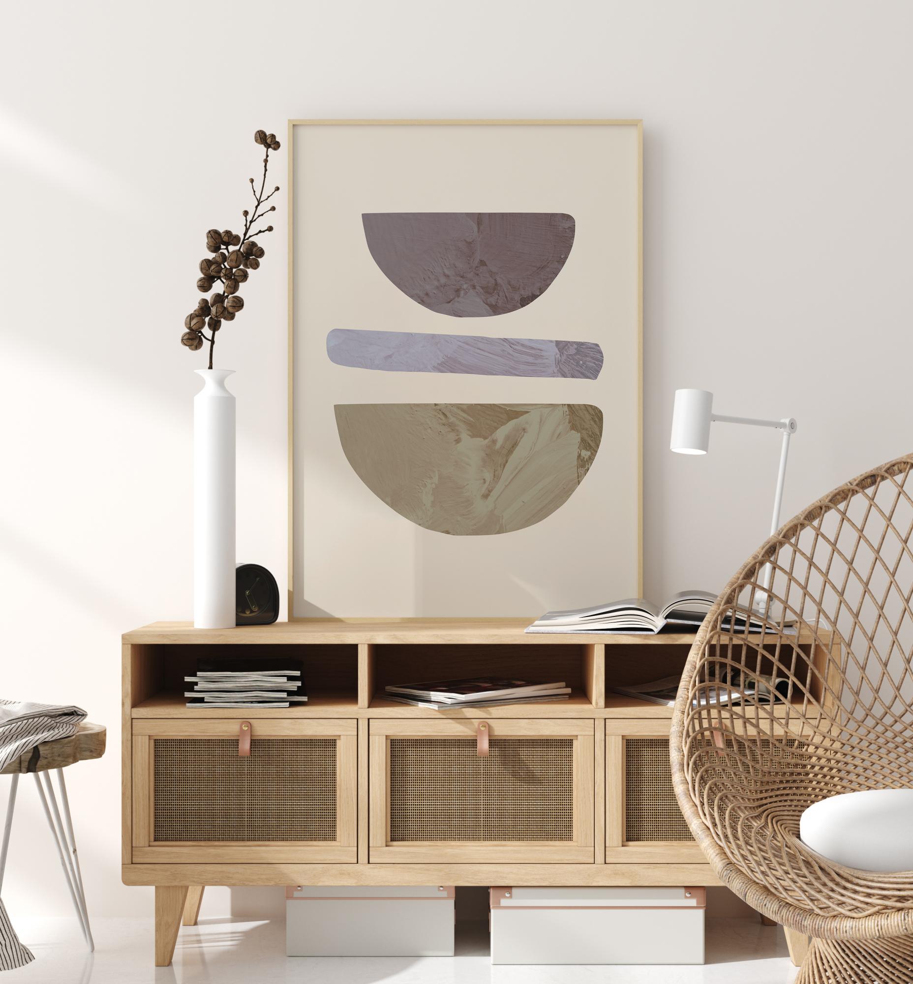 Un poster astratto con tre distinti forme di linee colorate. Un grande semicerchio color crema e beige è posizionato sul bordo inferiore e una sottile linea blu sopra di esso. Nella parte superiore c'è un secondo semicerchio in grigio e blu. Quando appendi quest'opera nelil tuo ingresso di casa diventa argomento di conversazione.