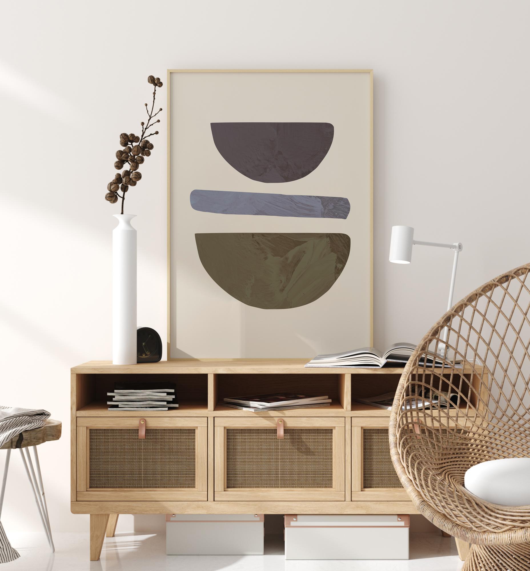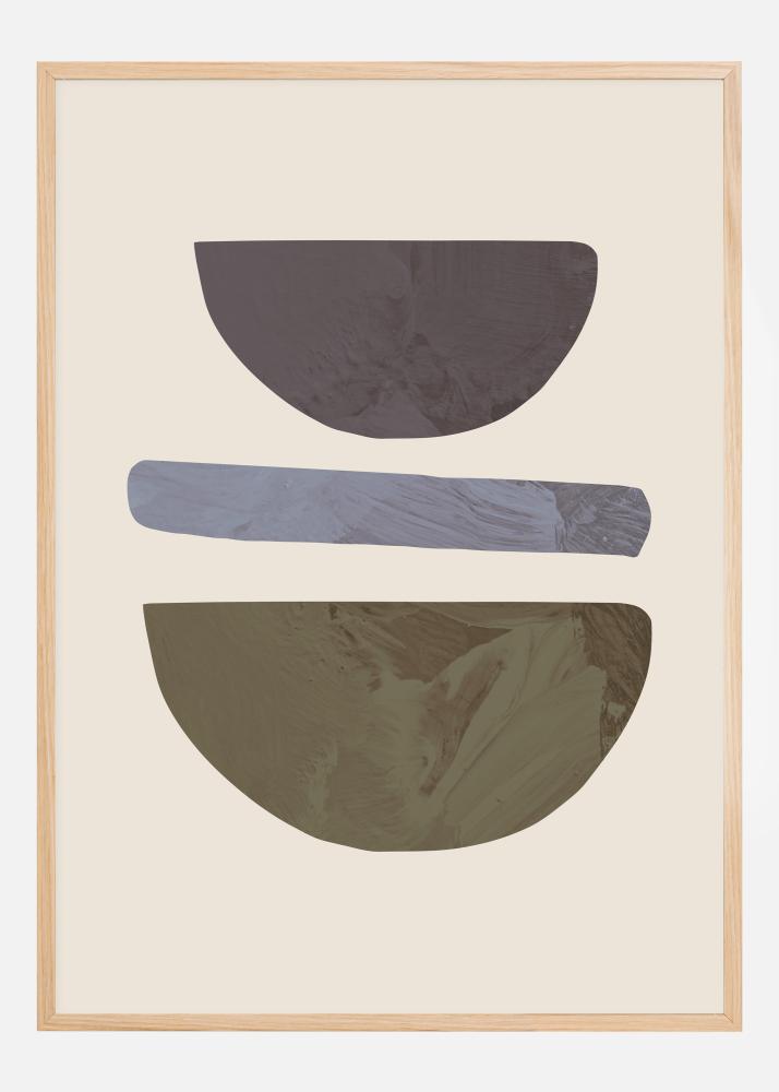 Un poster astratto con tre diverse forme e colori. Un semicerchio marrone è posizionato nella parte inferiore con una linea azzurra chiara al centro dell'immagine. Sopra c'è un semicerchio grigio scuro. Il tutto su uno sfondo bianco. Appendi questa opera su una parete liscia per ottenere il miglior effetto.