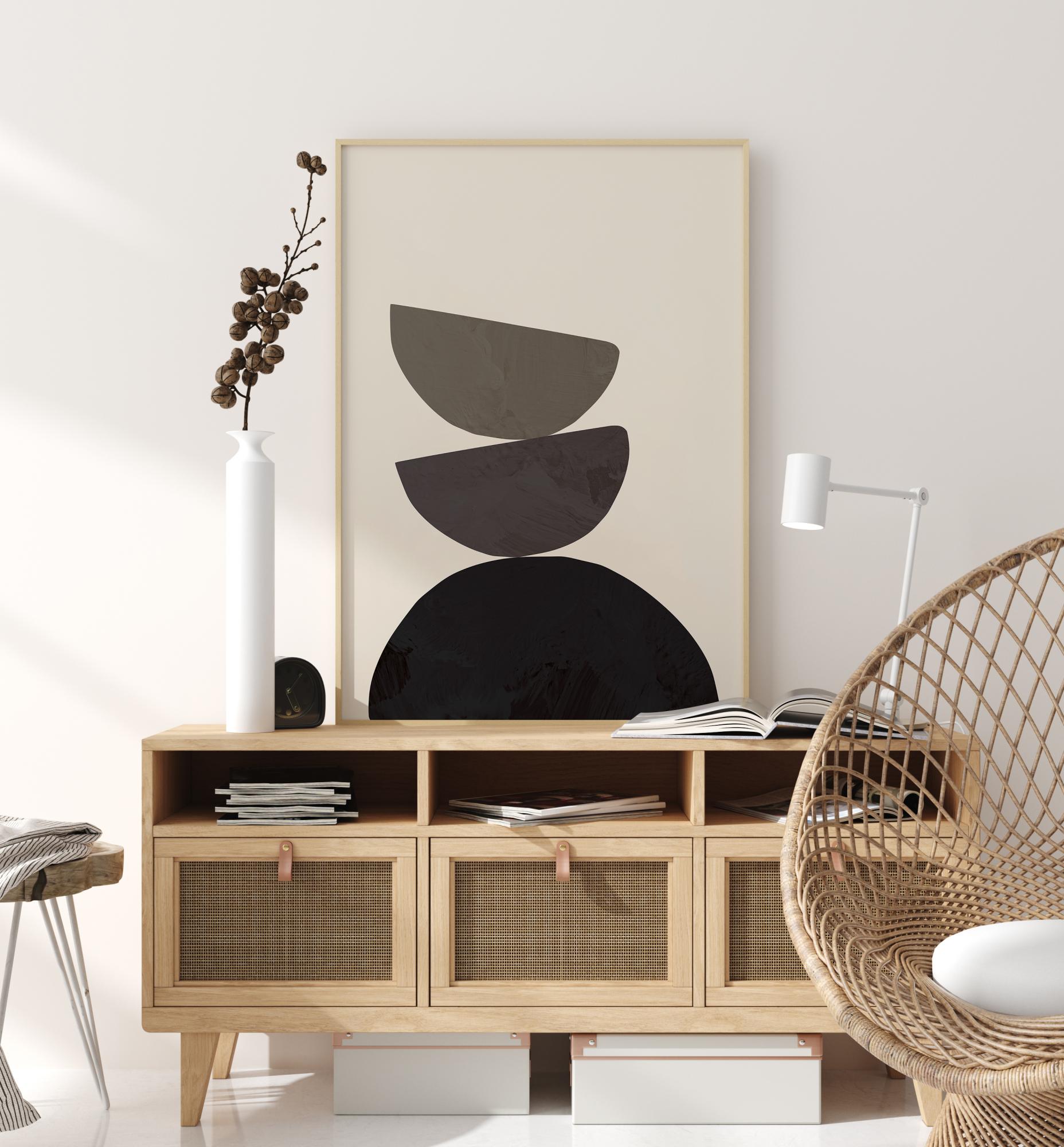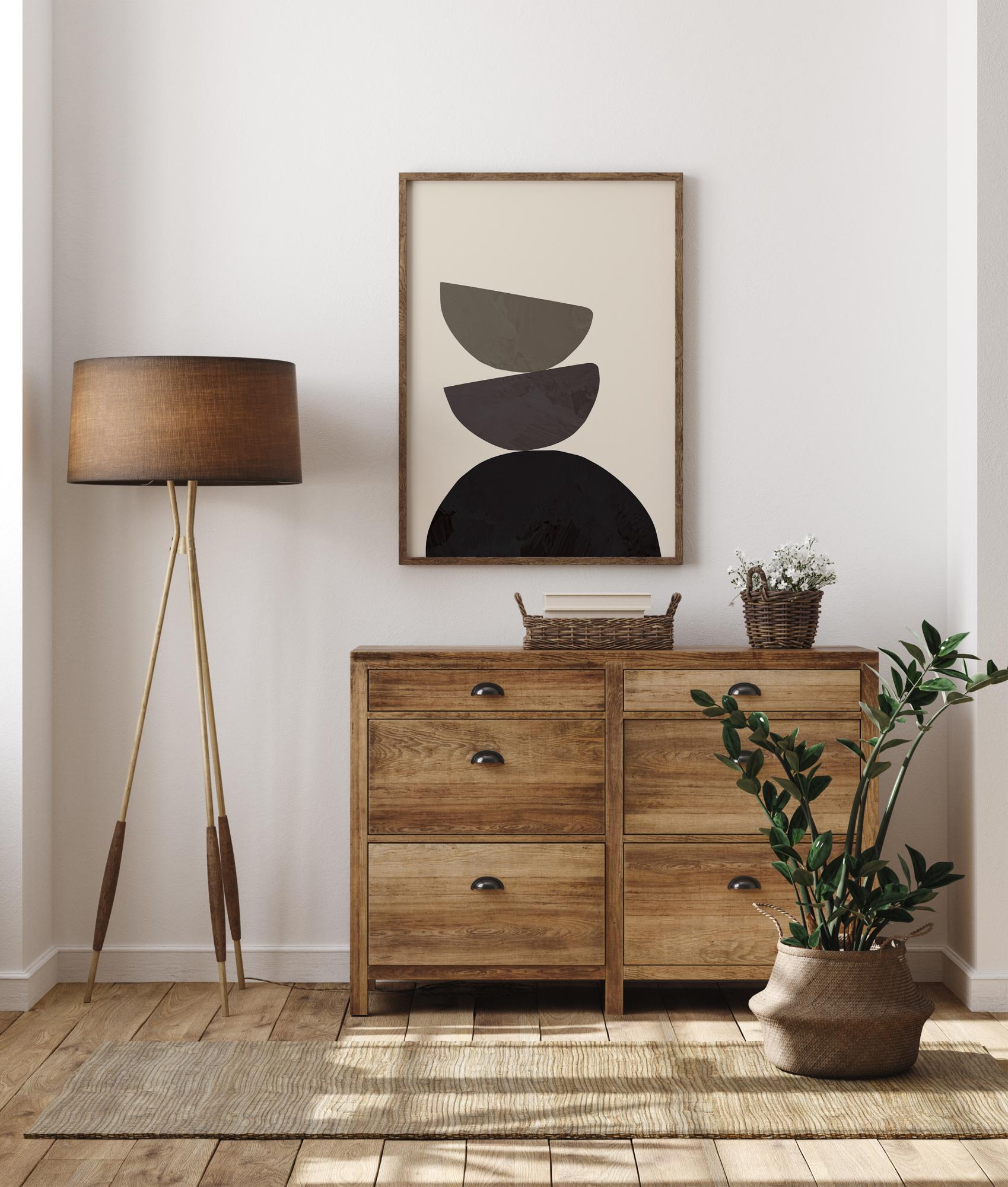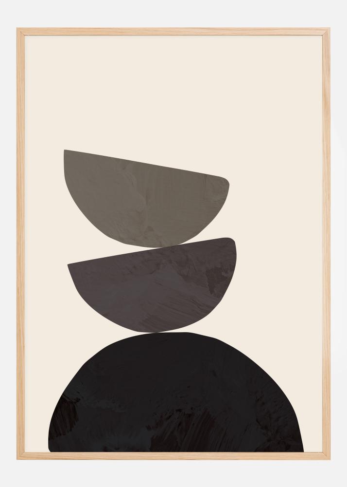 Un poster con tre semicerchi impilati che si bilanciano l'uno sull'altro. In fondo c'è un semicerchio nero con due semicerchi rivolti verso l'alto in diverse tonalità di grigio. Goditi le forme bilanciate quando appendi questa immagine su una parete di colore chiaro.