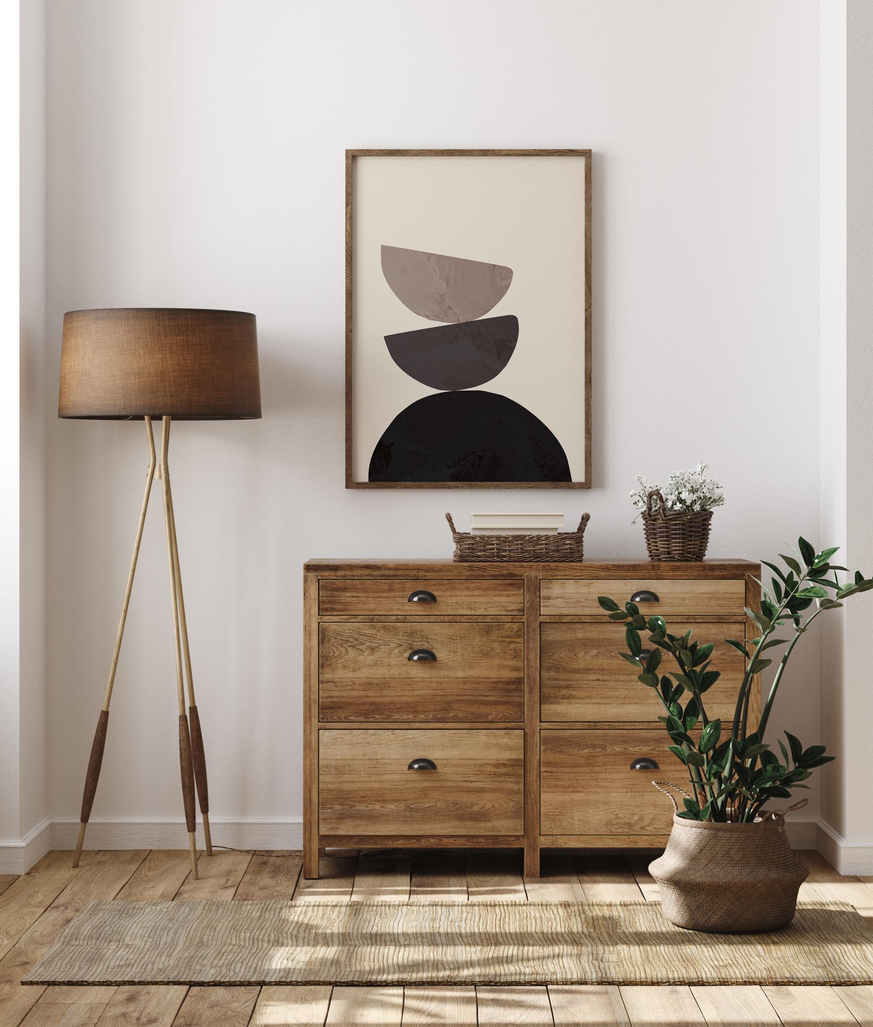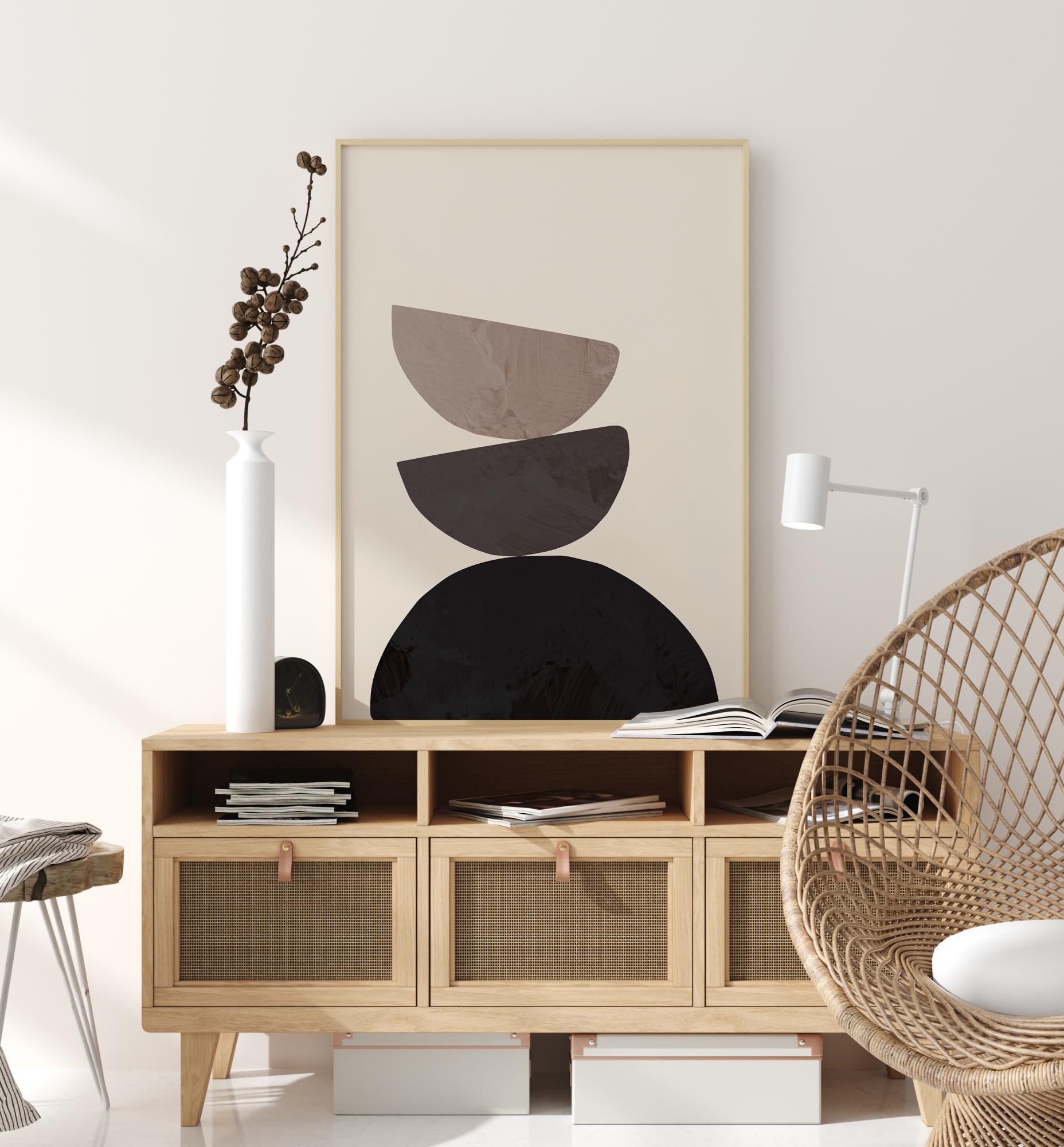 Un semplice poster astratto con tre semicerchi diversi. Ogni semicerchio ha una tonalità di grigio individuale che va dal nero in basso al grigio chiaro in cima. Si bilanciano l'uno sull'altro, dando una sensazione di stabilità precisa all'opera.