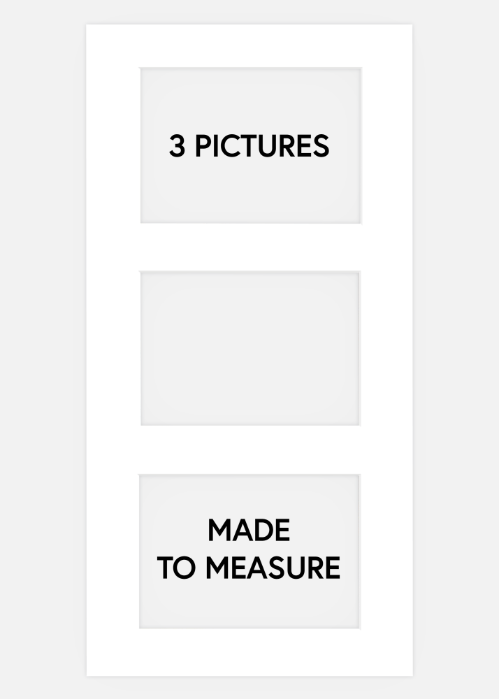 Qui puoi ordinare comodamente passe-partout multiplo con spazio per 3 immagini. Per effettuare l'ordine, devi indicare le dimensioni esterne del passe-partout (che devono essere le stesse dimensioni della cornice che intendi utilizzare), quindi devi indicare le dimensioni interne desiderate, che devono essere sempre 1 cm più piccole delle immagini che intendi utilizzare. Puoi ordinare solo qui se hai tre immagini della stessa dimensione, se desideri passe-partout multiplo più avanzati devi contattare il nostro servizio clienti per il tuo ordine.