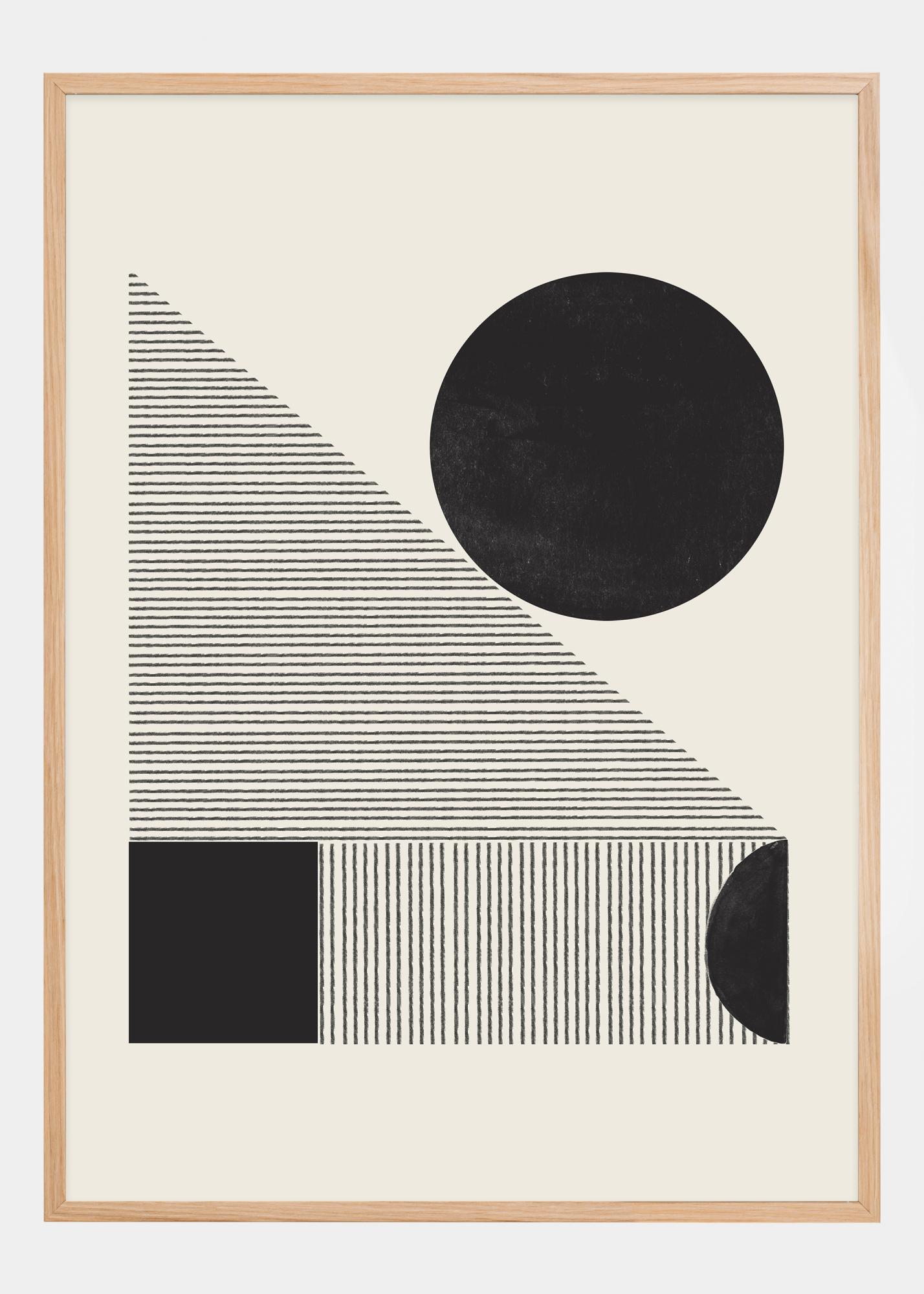Questo poster è un'interpretazione giocosa e sofisticata dell'astrazione geometrica. Linee nere e bianche interagiscono in un motivo di forme accuratamente bilanciato, mentre il grande cerchio nero domina la parte superiore della composizione creando un forte ancoraggio visivo. Il contrastante gioco tra le aree nere piene e le linee bianche invita lo spettatore ad esplorare le diverse texture e profondità dell'immagine.