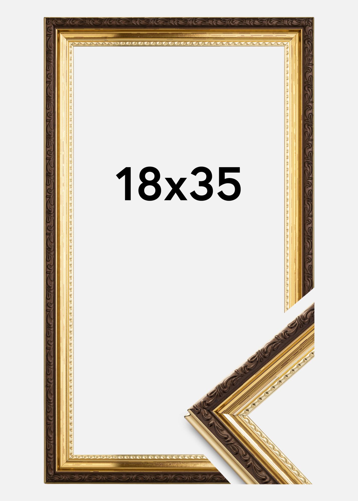 Stai cercando una cornice decorata in uno stile antico? Abisko Vetro Acrilico Oro è una robusta cornice dorata con ornamenti eleganti. La larga cornice di 25 mm ha un colore dorato lucido con una bordatura marrone decorata al centro. Anche la parte dorata è decorata con un motivo ondulato vicino al vetro.