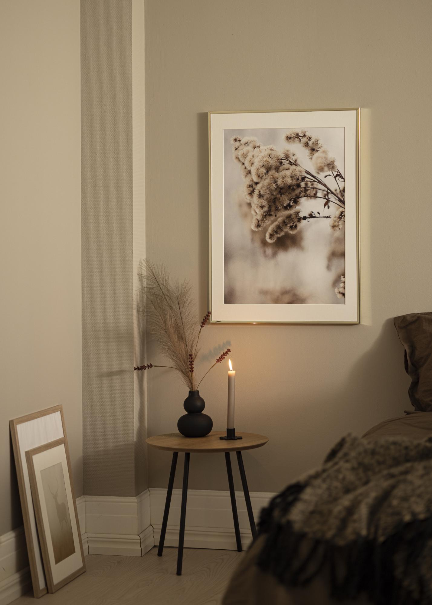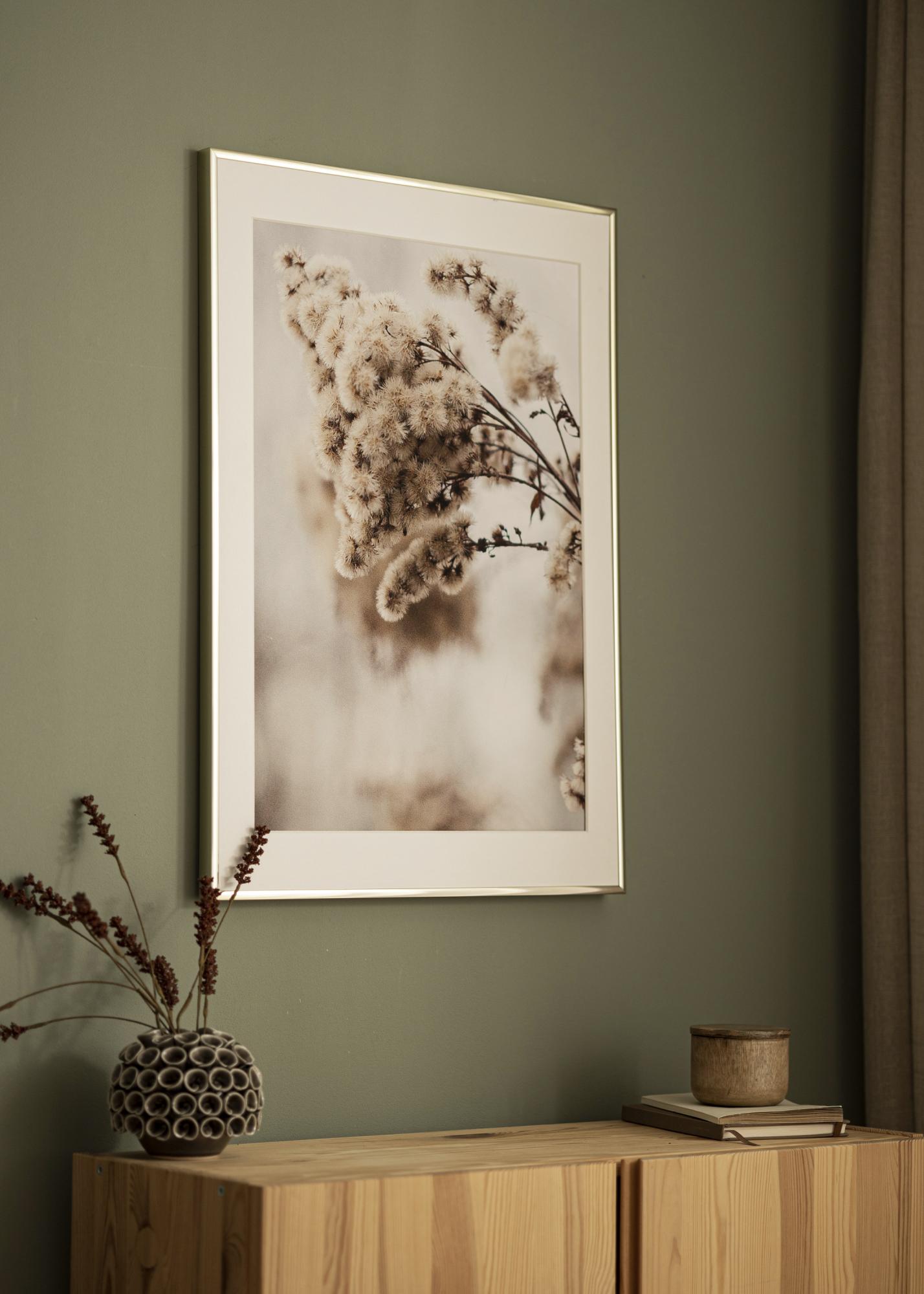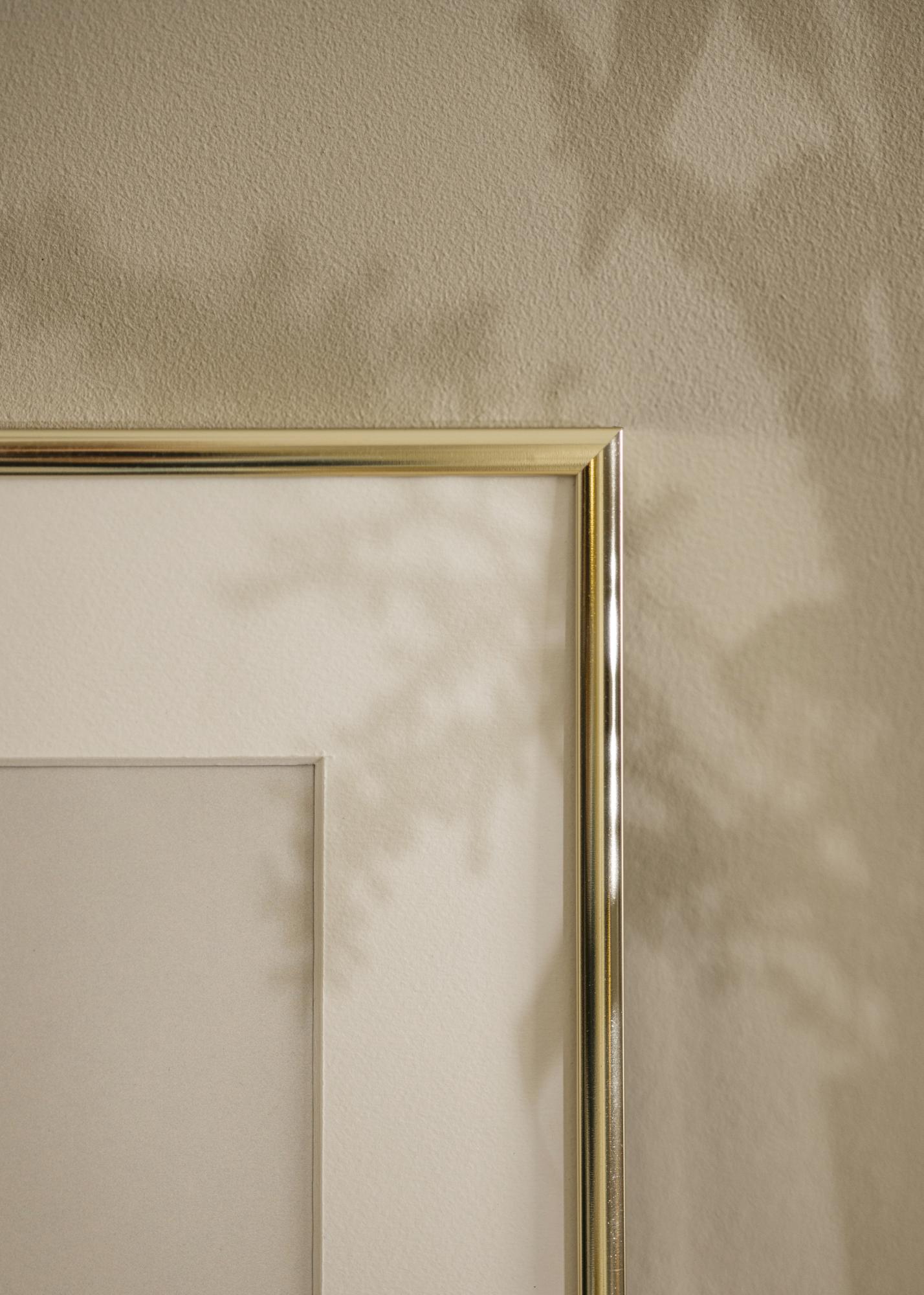 Questo è un sottile telaio in alluminio con un elegante finitura dorata lucida. Il sottile bordo del telaio, di soli 9 mm, fa sì che l'attenzione principale sia rivolta ai tuoi motivi. È perfetto se hai poster alla moda o foto dei tuoi cari che desideri mettere in mostra sul muro.
