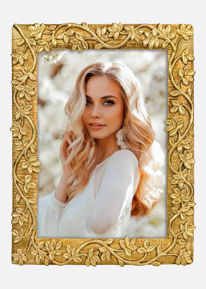 Rendi un tocco di regalità alle tue foto preferite con questa magnifica cornice dorata per ritratti. Con le sue decorazioni floreali intricate, ogni foto diventa un'opera d'arte a sé. Le dimensioni della cornice sono 13x18 cm, perfette per esaltare i tuoi momenti più amati.