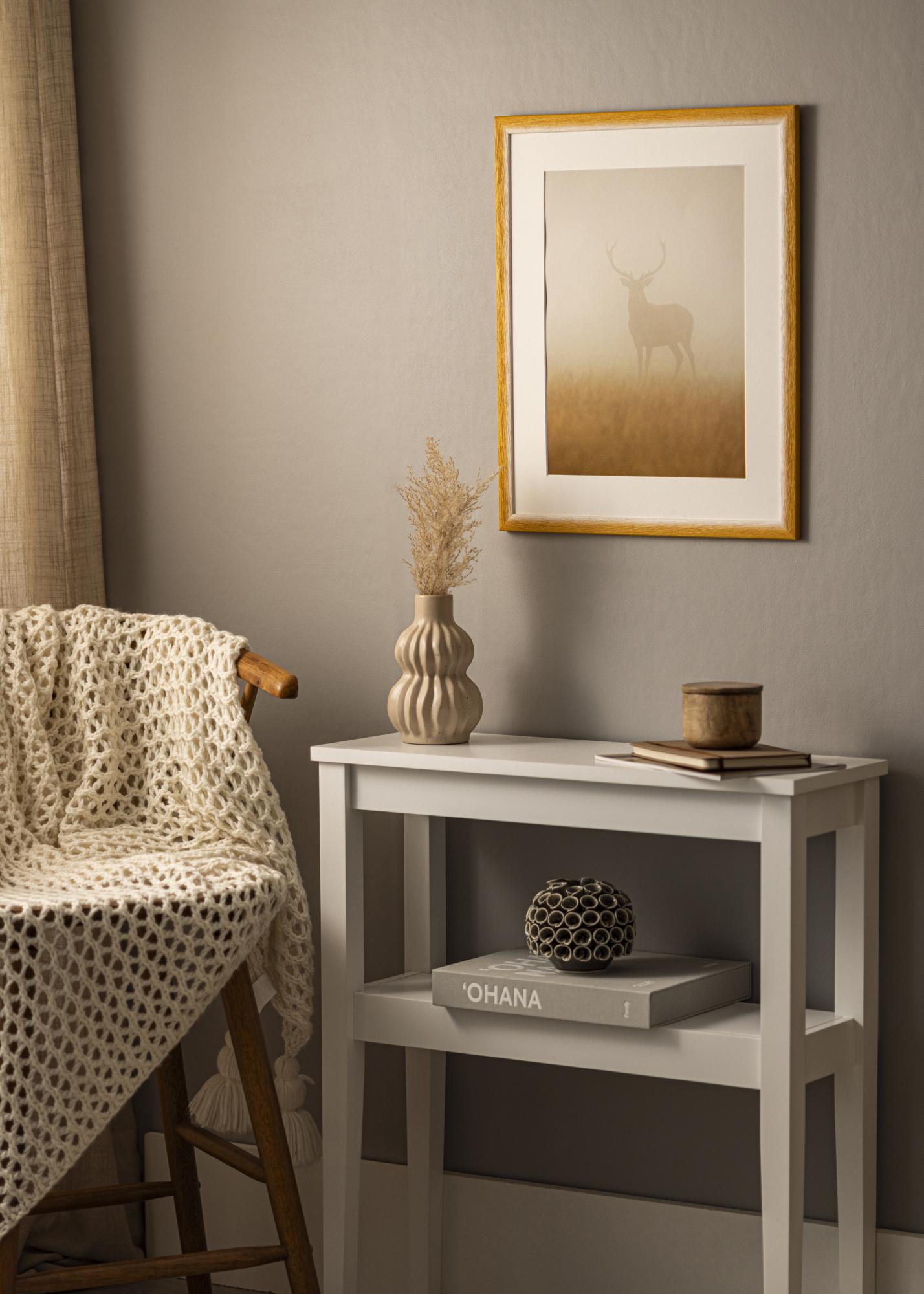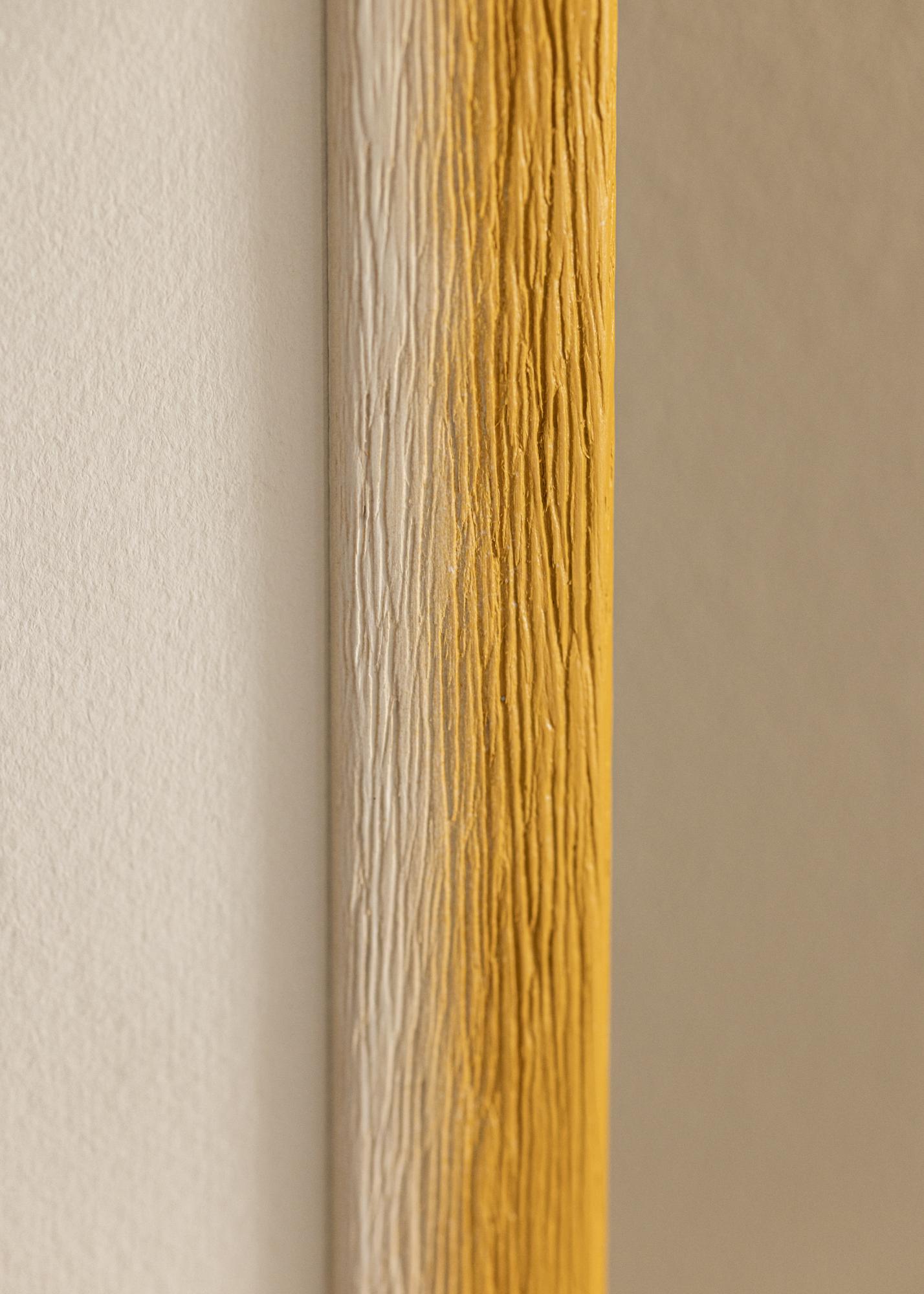 Questa cornice ha una transizione cromatica armoniosa da una tonalità bianco naturale chiara a una calda sfumatura giallo ocra. La superficie è caratterizzata da una struttura in legno evidente con venature profonde, che offre una sensazione tattile e naturale. La sottile transizione tra i colori crea un'espressione morbida e dipinta con una profondità vibrante che arricchisce ogni immagine.