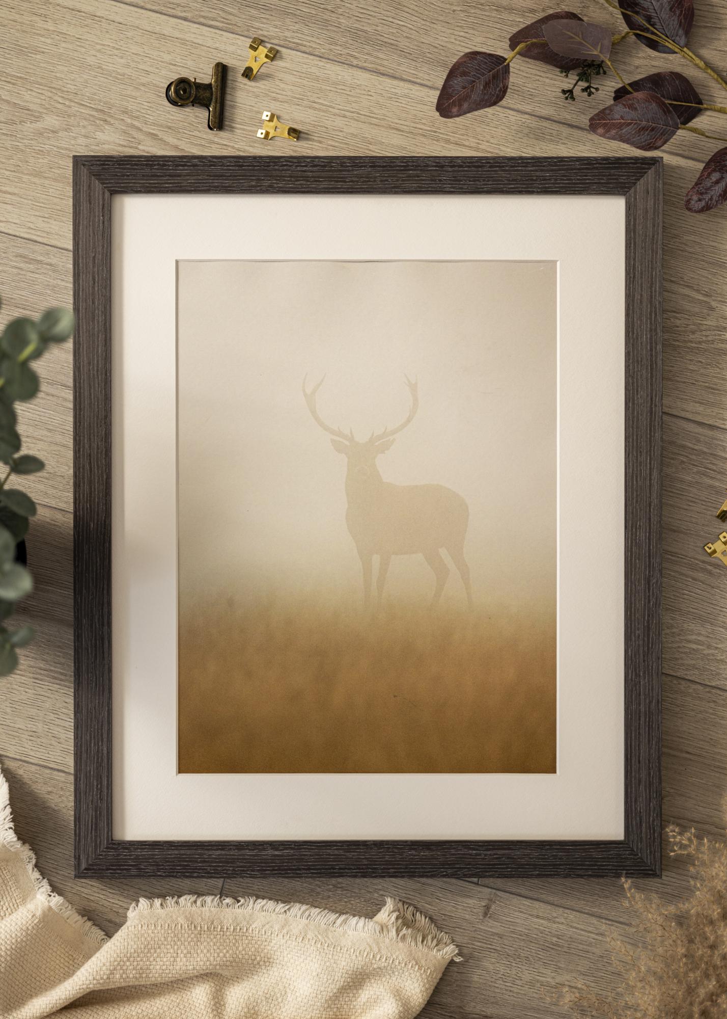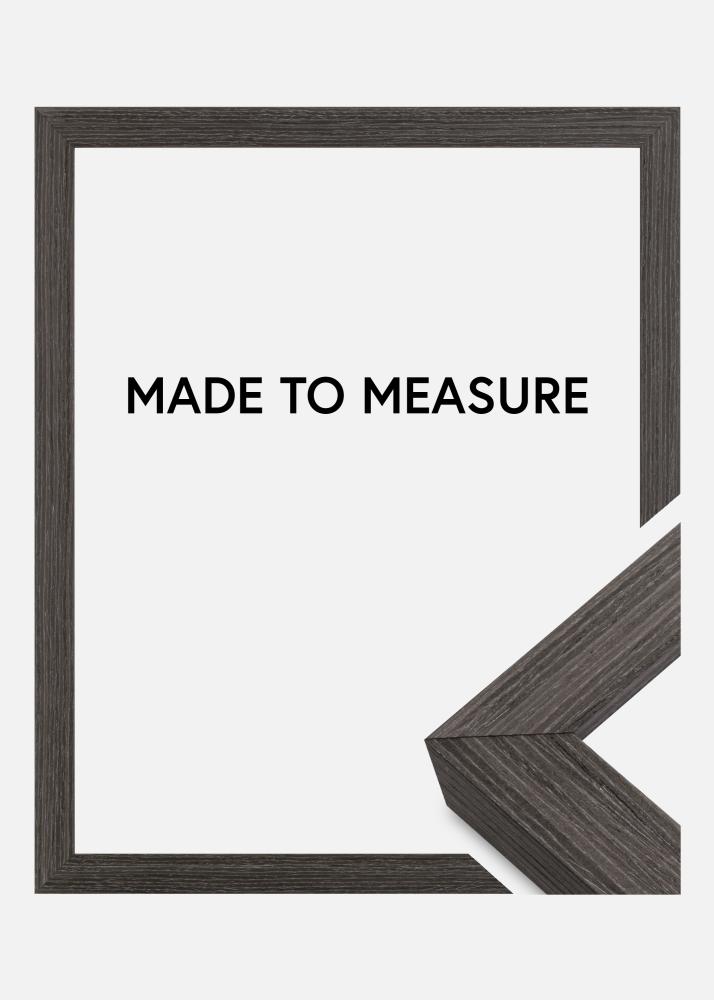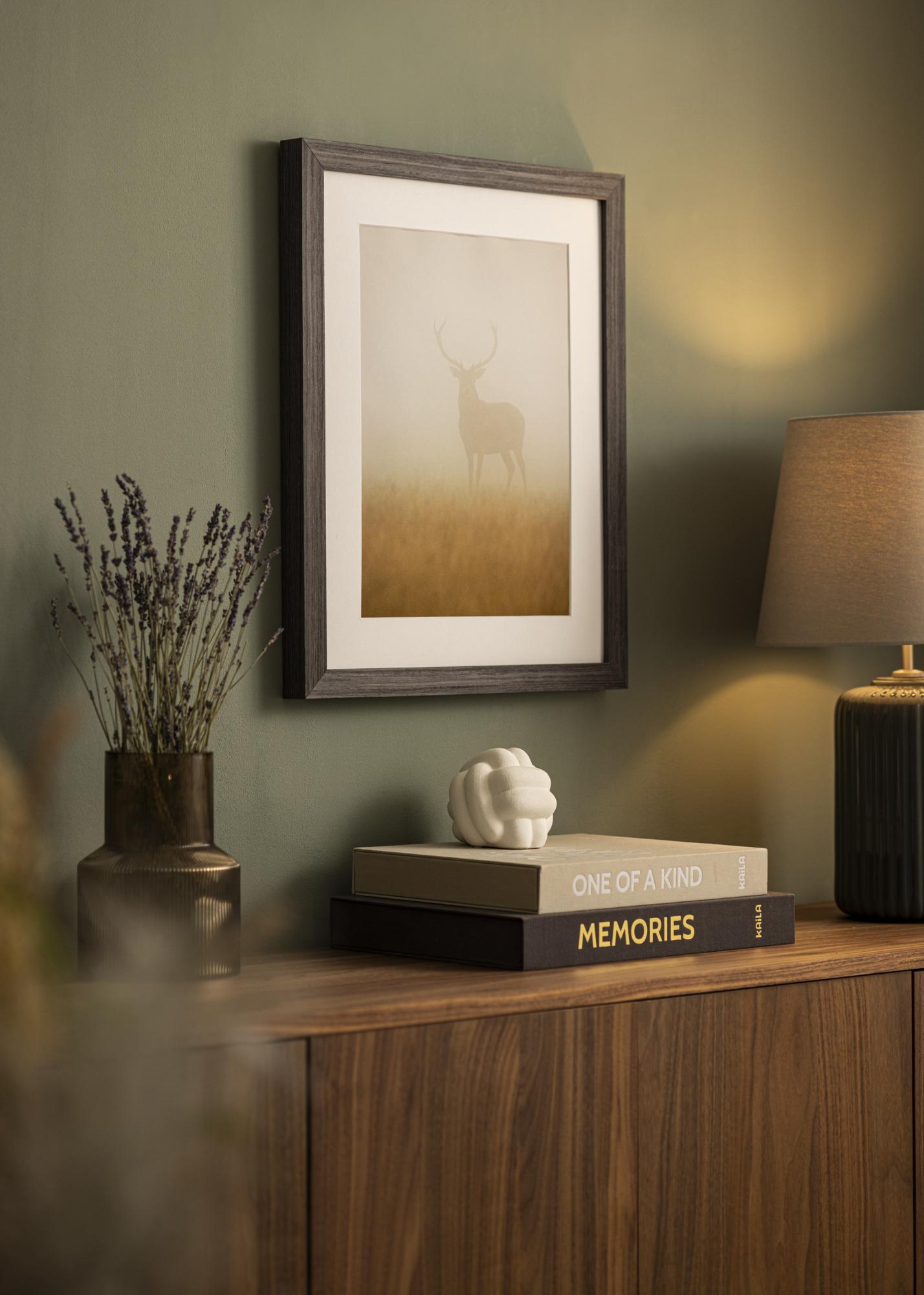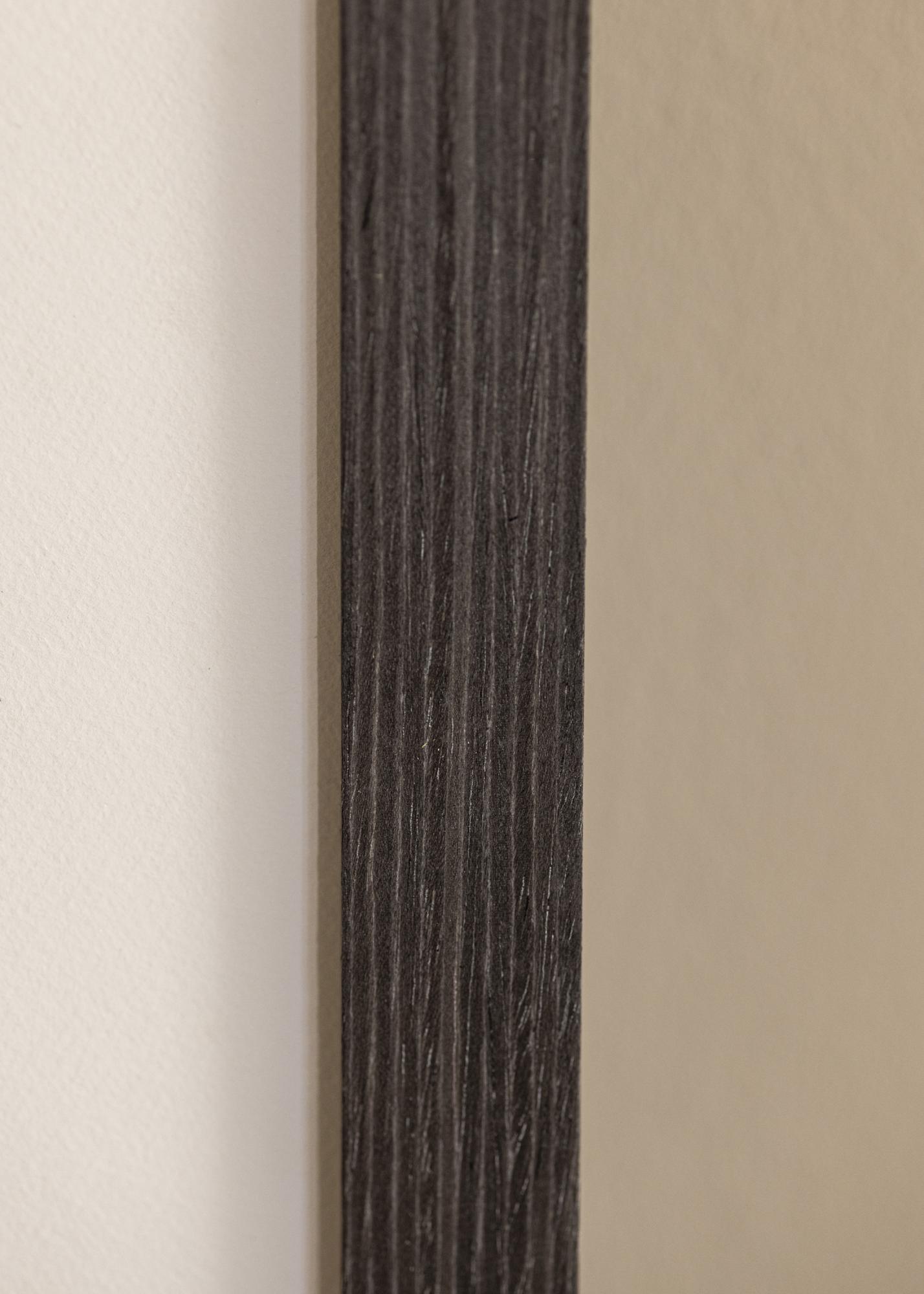 Questa cornice è realizzata in pino e ha una finitura in legno scuro con una struttura chiaramente venata. La tonalità scura, quasi nero-bruna, permette alla texture naturale del legno di emergere attraverso una superficie leggermente opaca, esaltando il suo aspetto naturale. Il profilo sottile e dritto conferisce un'espressione discreta ed elegante che si adatta alla maggior parte degli ambienti.