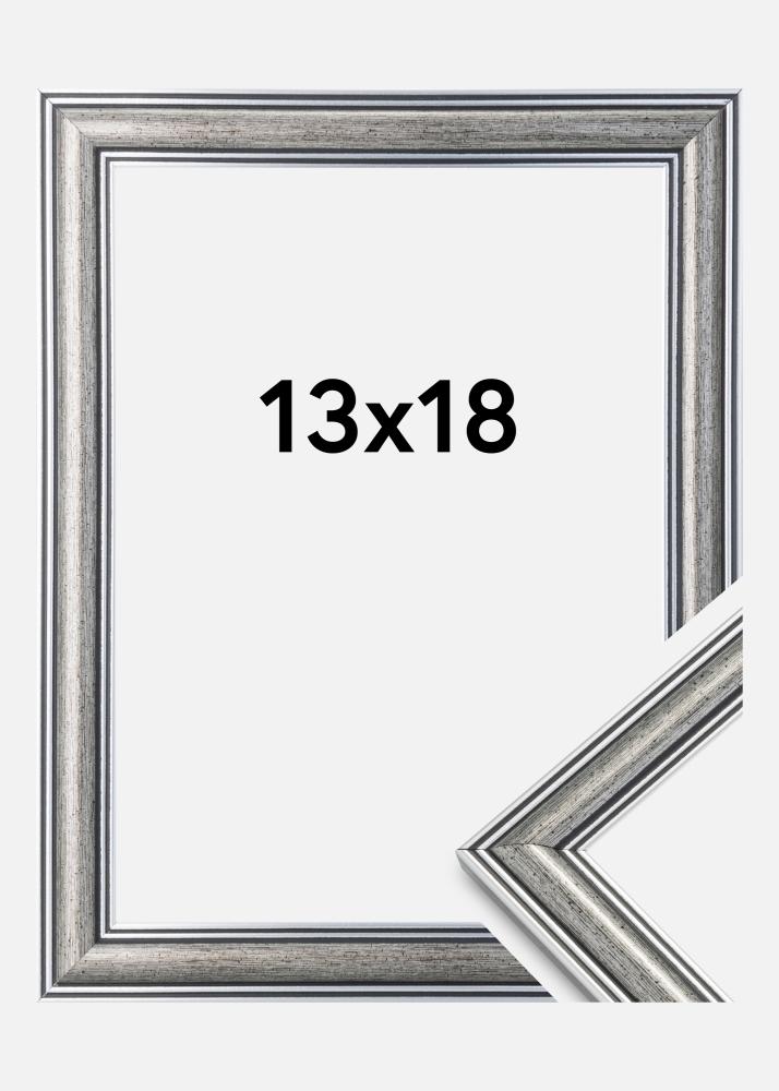 Frigg è una cornice d'argento con linee nere e sfumature nere. È perfetta quando cerchi una cornice d'argento tradizionale e ampia che si adatta a molti tipi di immagini e ambienti.