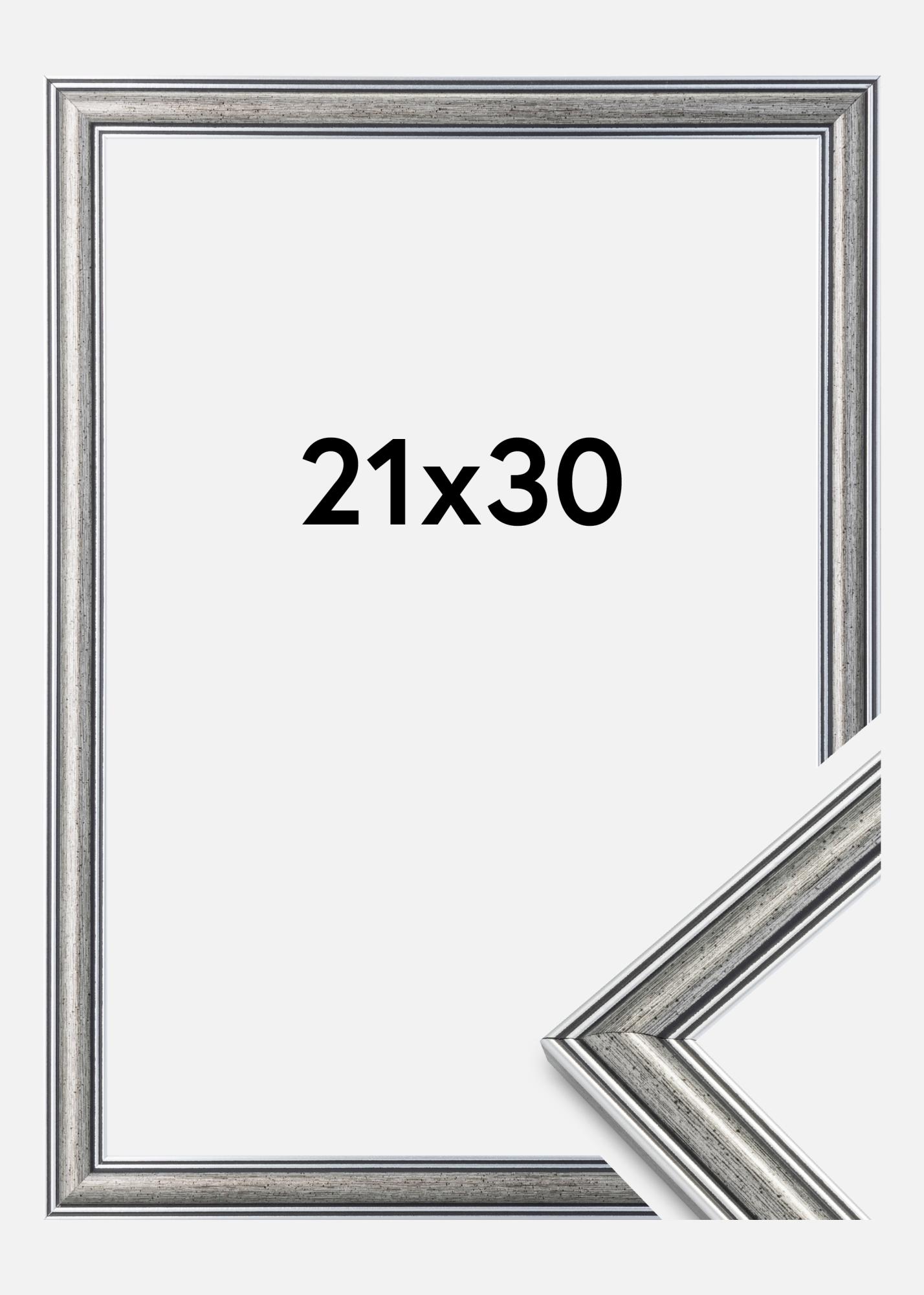 Frigg è una cornice d'argento con linee nere e sfumature nere. È perfetta quando cerchi una cornice d'argento tradizionale e ampia che si adatta a molti tipi di immagini e ambienti.
