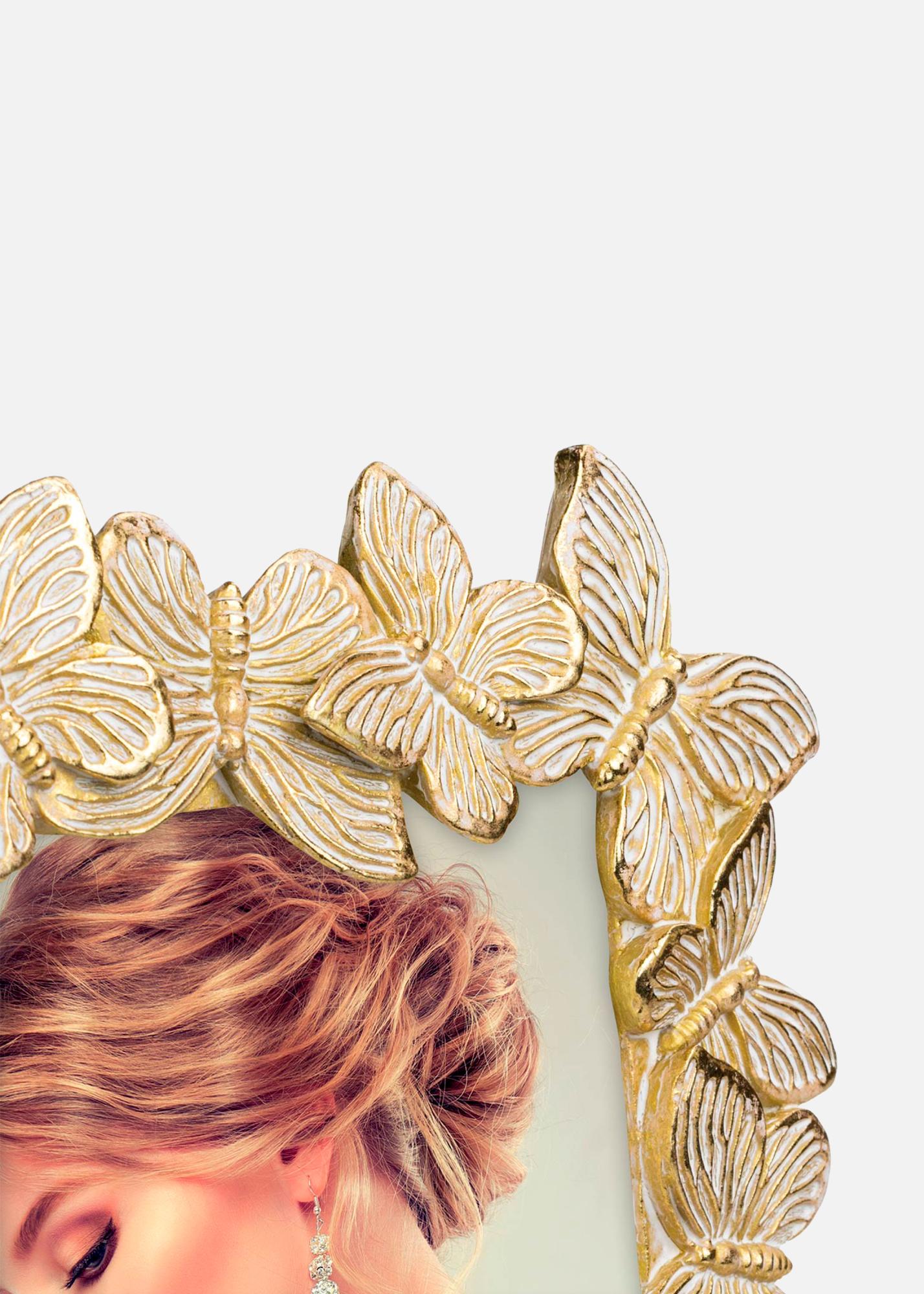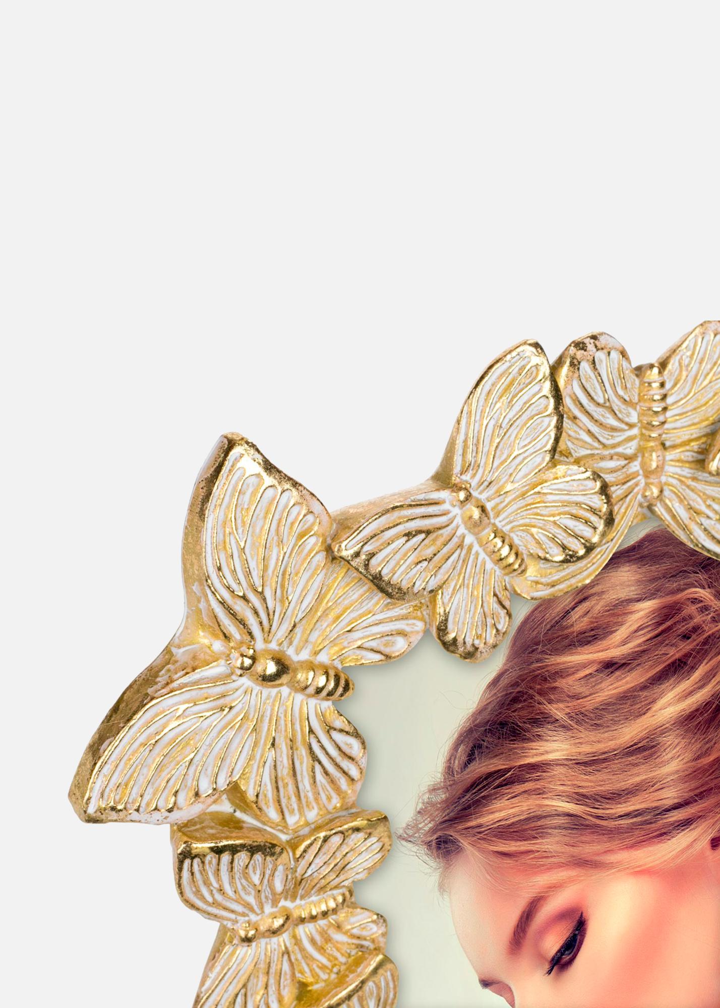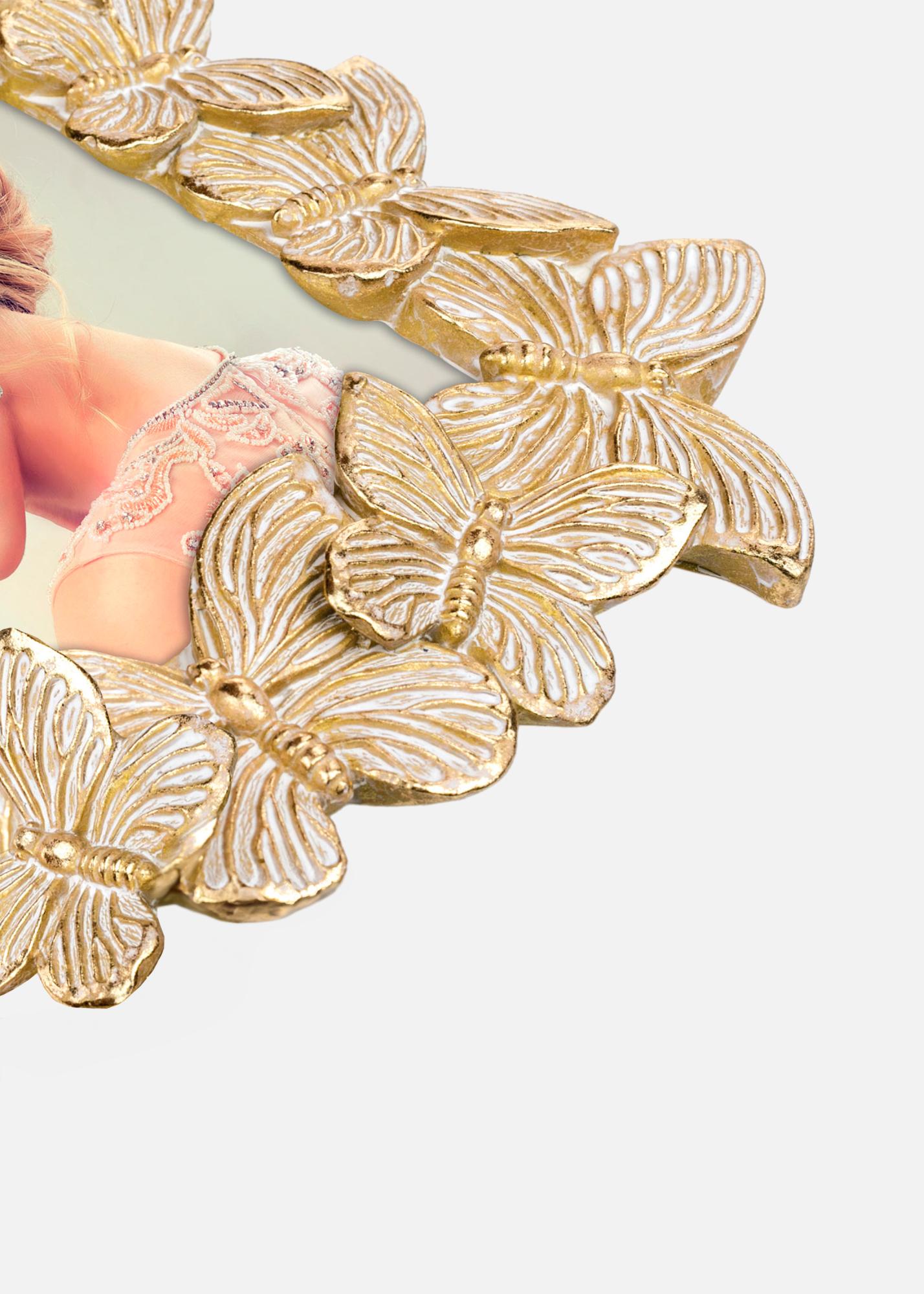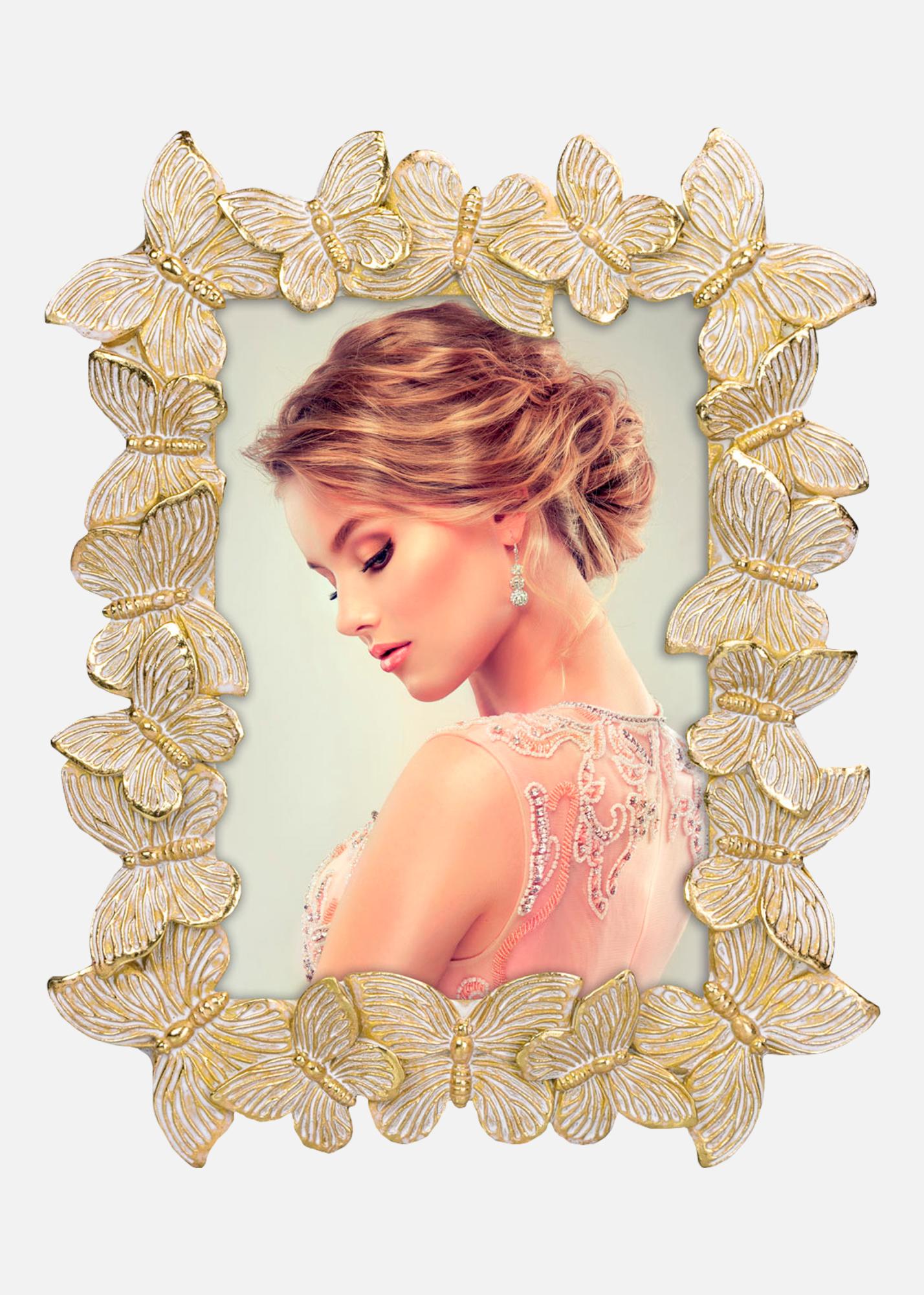 Scopri la bellezza incantata del nostro porta ritratti di dimensioni 13x18 cm, un vero e proprio punto focale per la tua casa. Questo unico porta foto è adornato con un profilo di cornice ricco di farfalle in oro e bianco, che donano un tocco giocoso ed elegante alle tue foto preferite.
