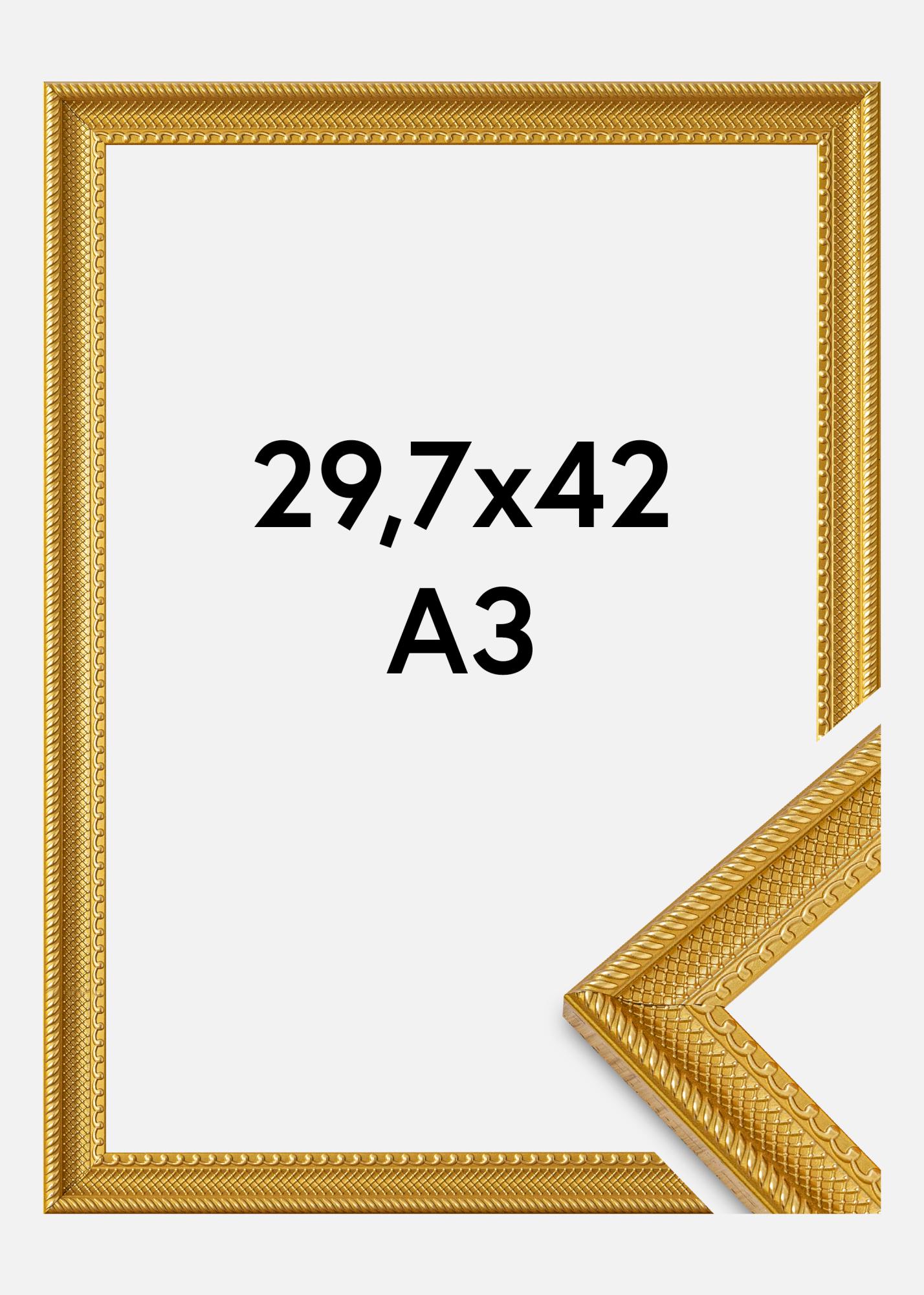 Questa elegante cornice dorata è una perfetta combinazione di design classico e funzionalità moderna. Con i suoi dettagliati motivi lungo i bordi, offre una sensazione di lusso che esalta ogni opera d'arte o fotografia. La cornice è realizzata in materiale composito, il che le conferisce una struttura robusta e durevole. È progettata per adattarsi a soggetti delle dimensioni di 29,7x42 cm (A3), il che la rende ideale per esporre i tuoi ricordi preferiti in modo elegante.