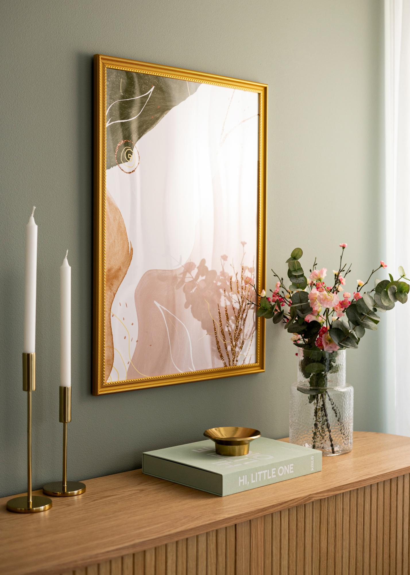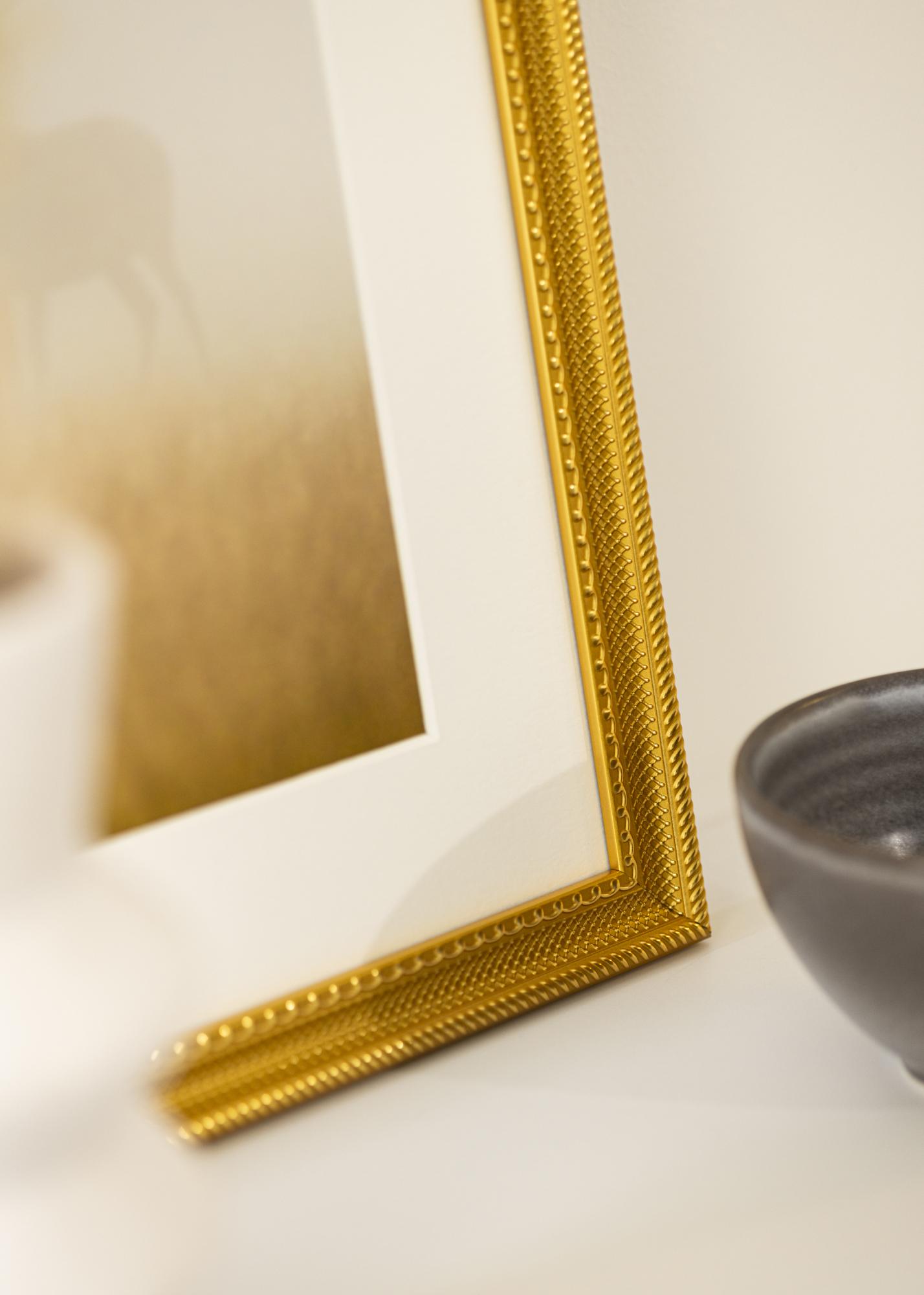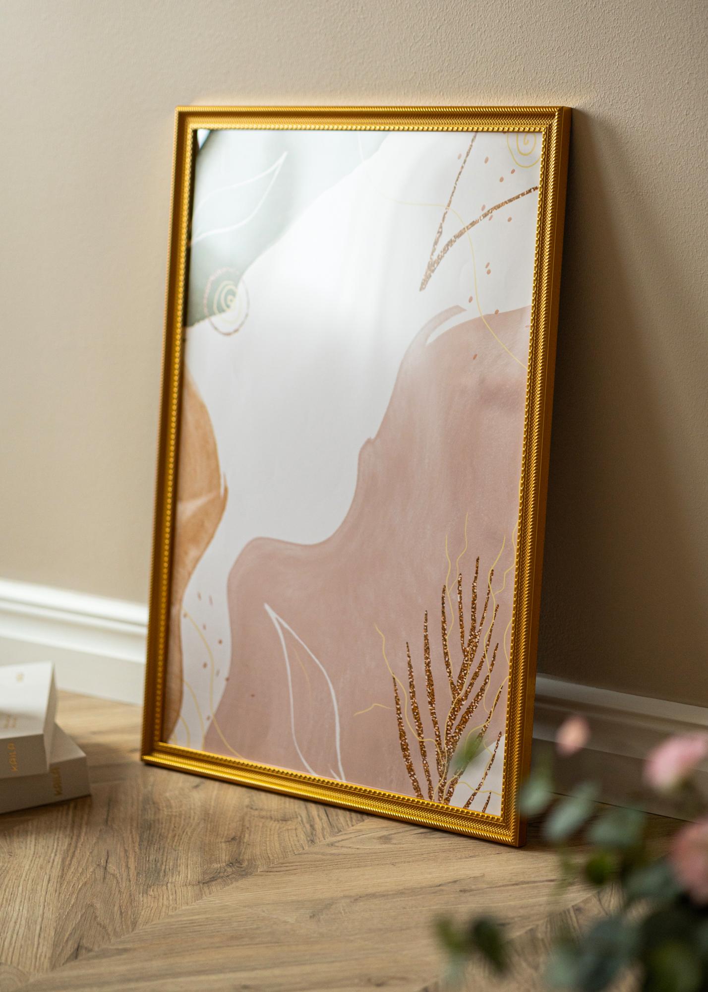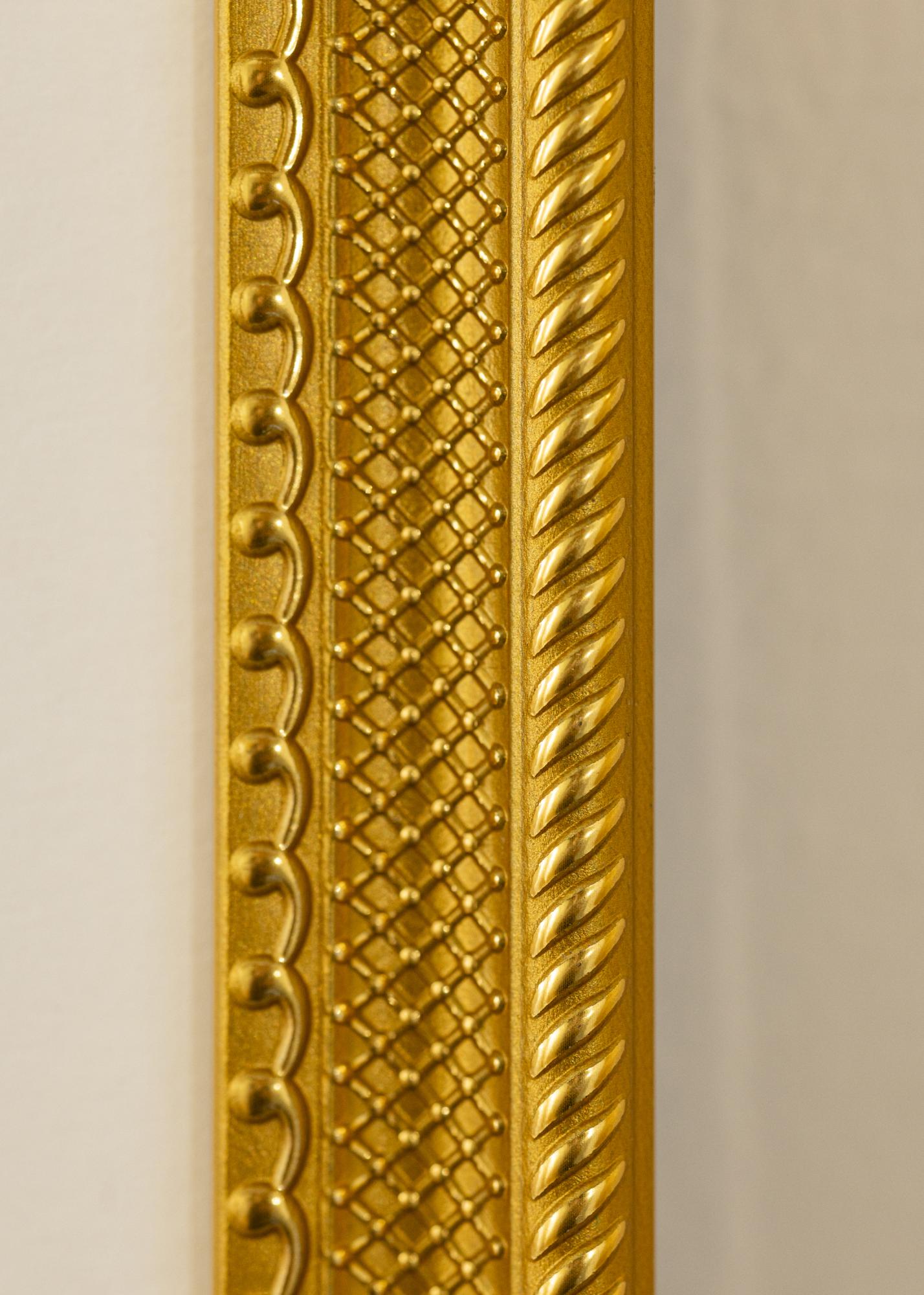 Questa elegante cornice dorata è una perfetta combinazione di design classico e funzionalità moderna. Con i suoi motivi dettagliati lungo i bordi e una finitura lucida, dona una sensazione di lusso che esalta qualsiasi opera d'arte o fotografia. La cornice è realizzata in materiale composito, conferendole sia resistenza che leggerezza. È progettata per ospitare soggetti delle dimensioni di 42x59,4 cm (A2), rendendola ideale per immagini più grandi o poster.