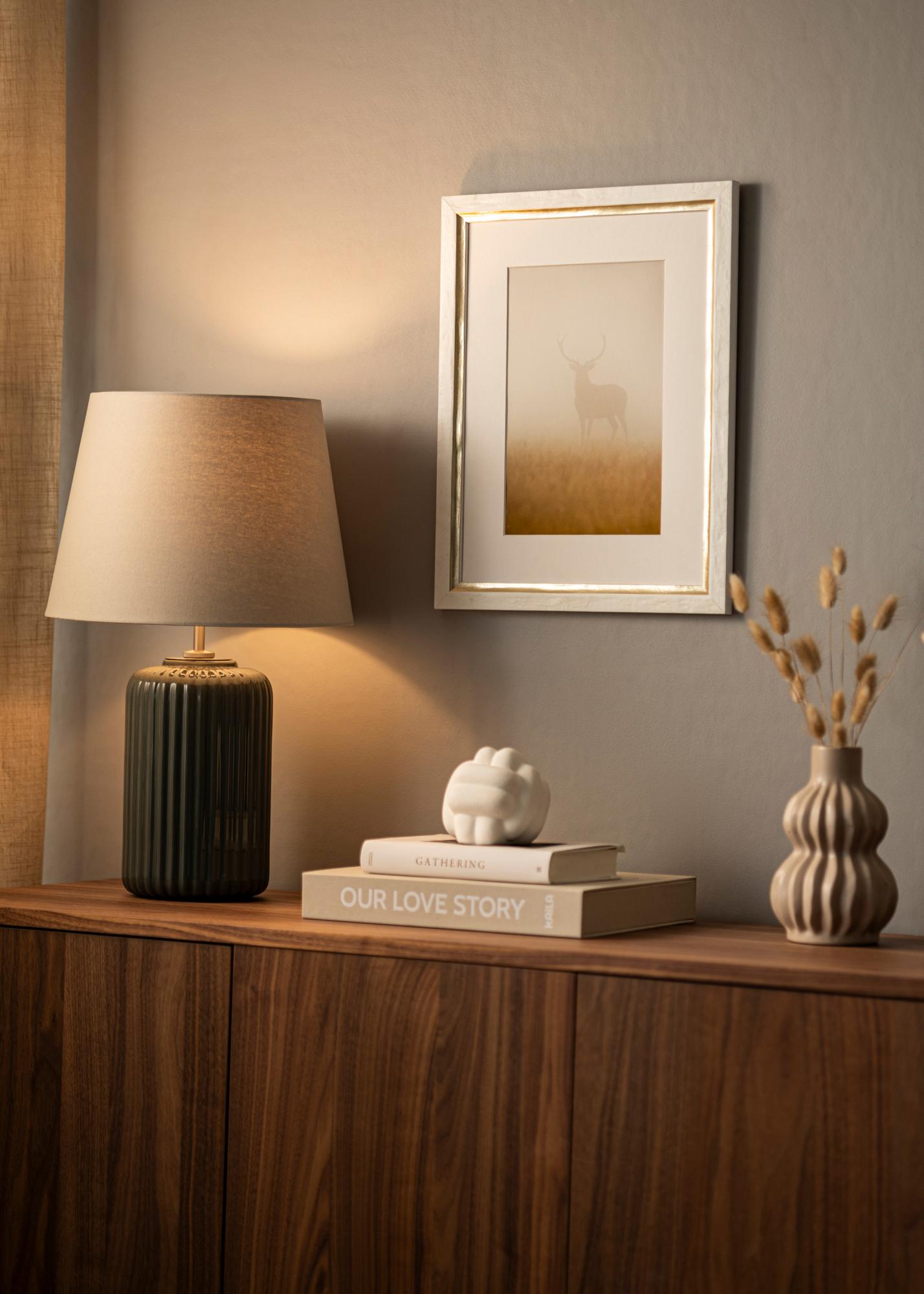 "Leonie" è una larga cornice per foto prodotta in Italia, il che garantisce alta qualità e design elegante. La cornice presenta un profilo elegante in bianco con una superficie chiaramente strutturata e un ampio bordo argentato vicino al motivo.