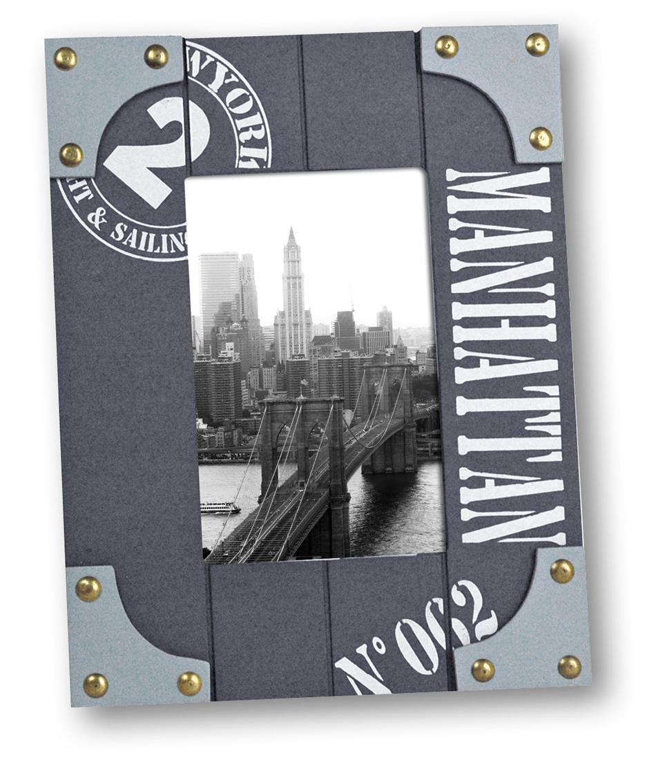 cornice dal design retrò con sfondo grigio scuro e chiari riferimenti a New York e Manhattan. La cornice ha un design unico con angoli grigi chiari rialzati decorati con eleganti borchie in ottone.