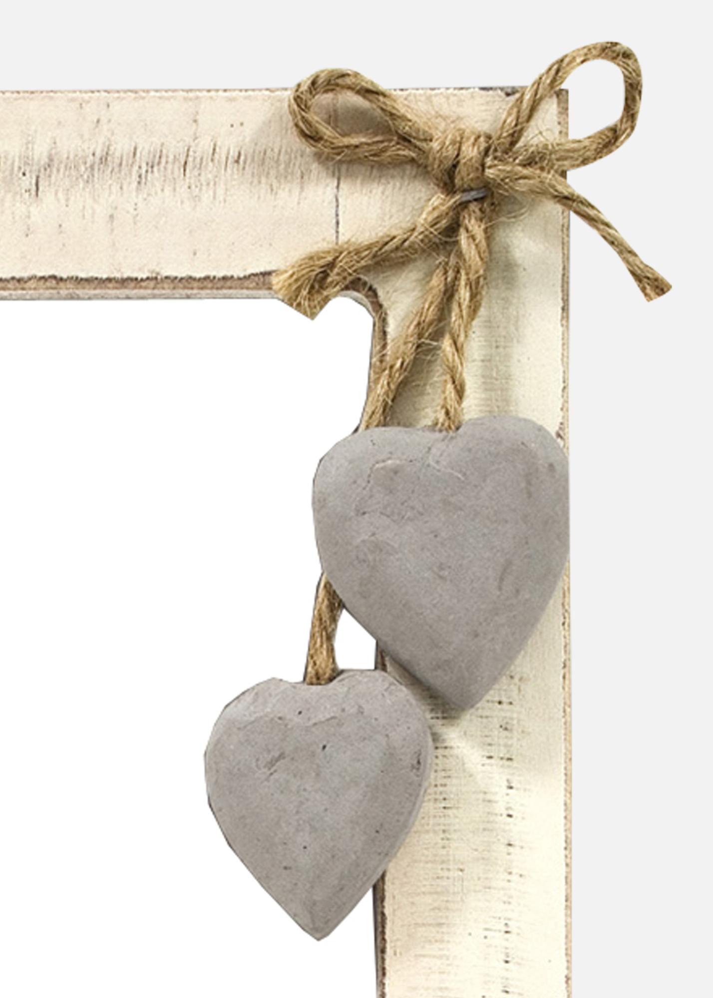 Metz è una cornice vintage di colore crema che dà un'idea di usura e dipinto a mano. La cornice ha un design che si concentra su dettagli carini, o cosa ne dici di piccoli cuori carini che pendono da un cordino di canapa? Vintage e romanticismo al suo meglio!