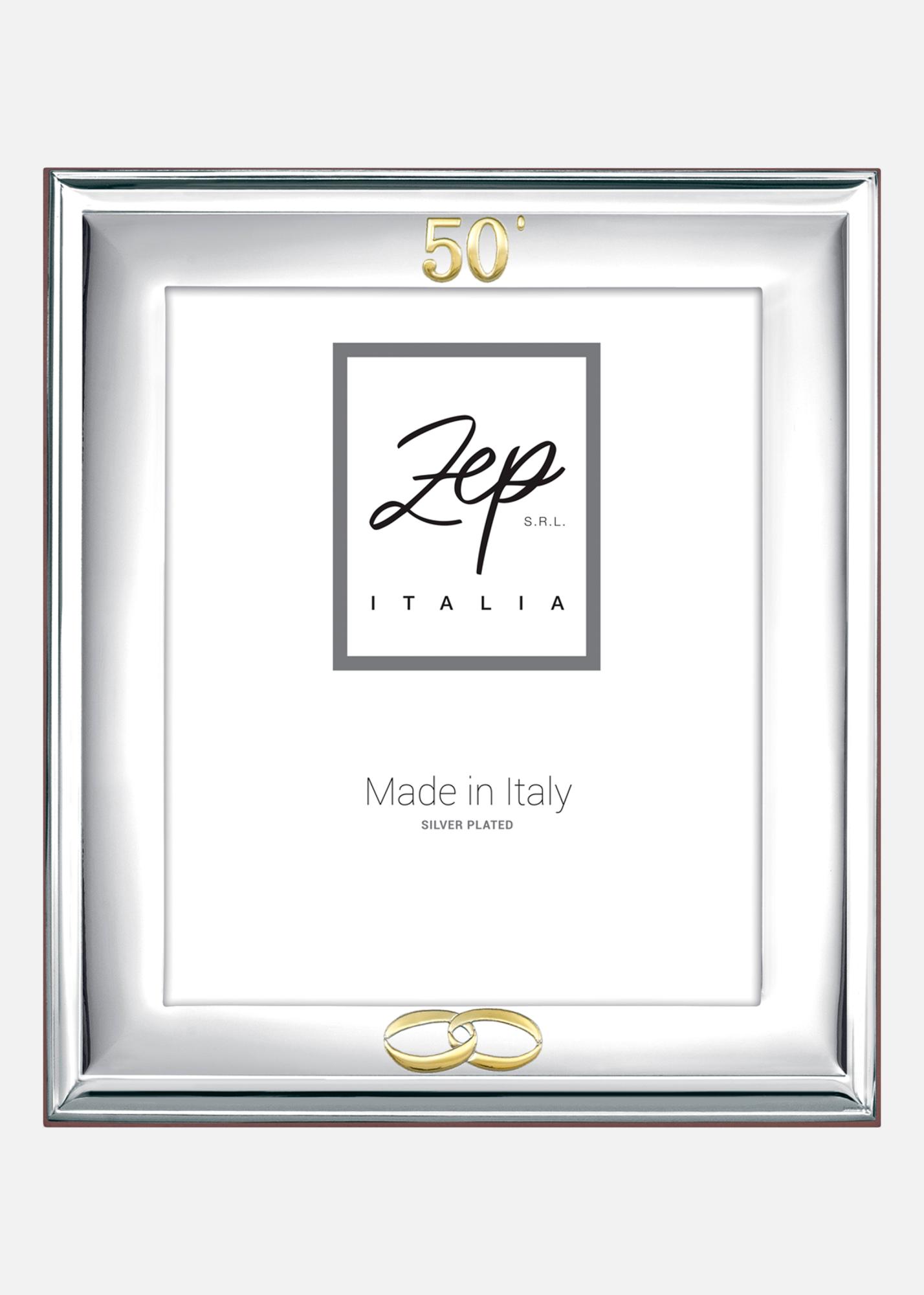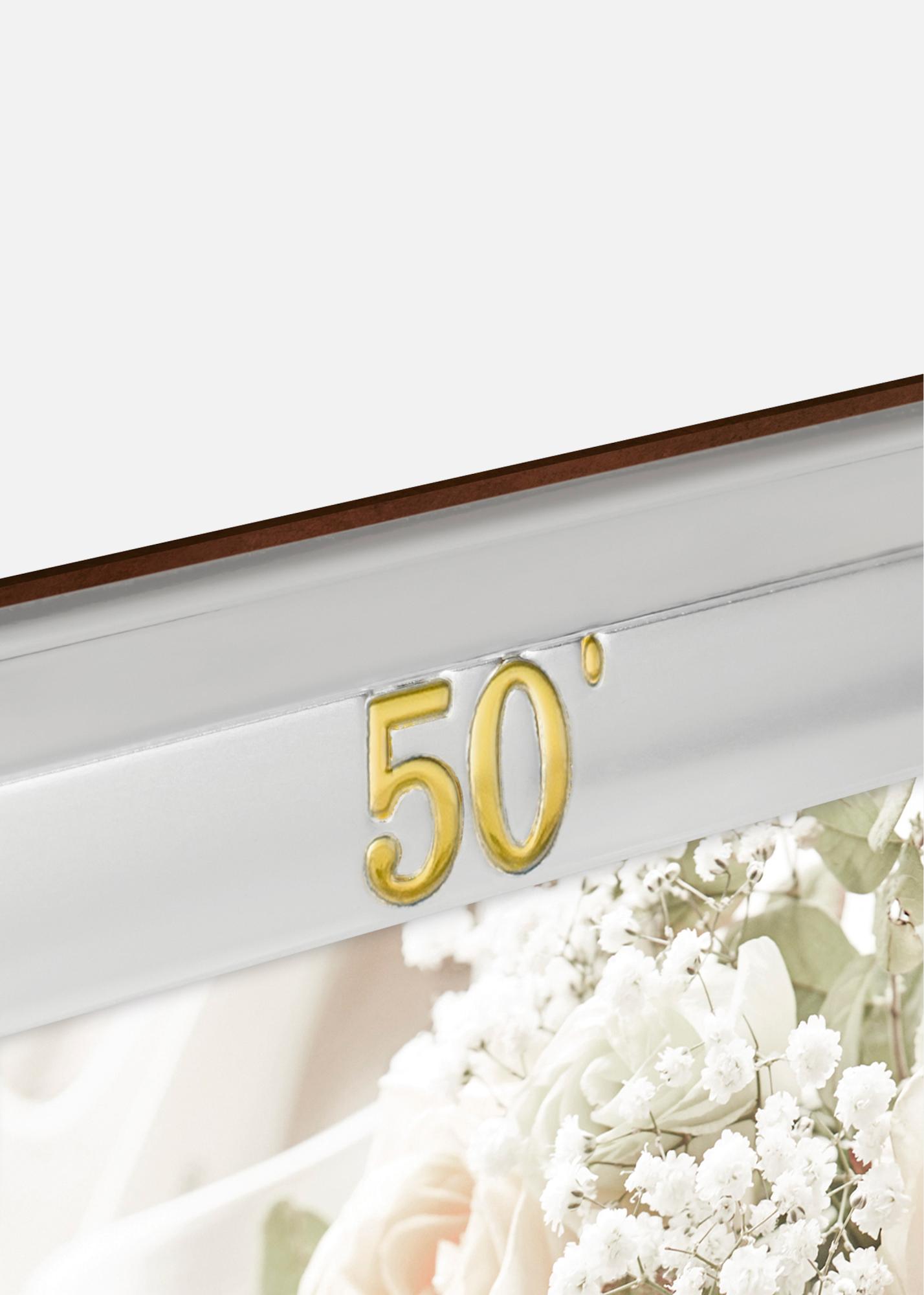 festeggiate mezzo secolo d'amore con una graziosa cornice in metallo color argento che esalterà i vostri più splendidi ricordi. Questa cornice per foto di 15x20 cm è decorata con dettagli simbolici che rappresentano i cinquanta anni di matrimonio, tra cui i classici numeri '50' e due adorabili anelli matrimoniali d'oro sulla cornice.
