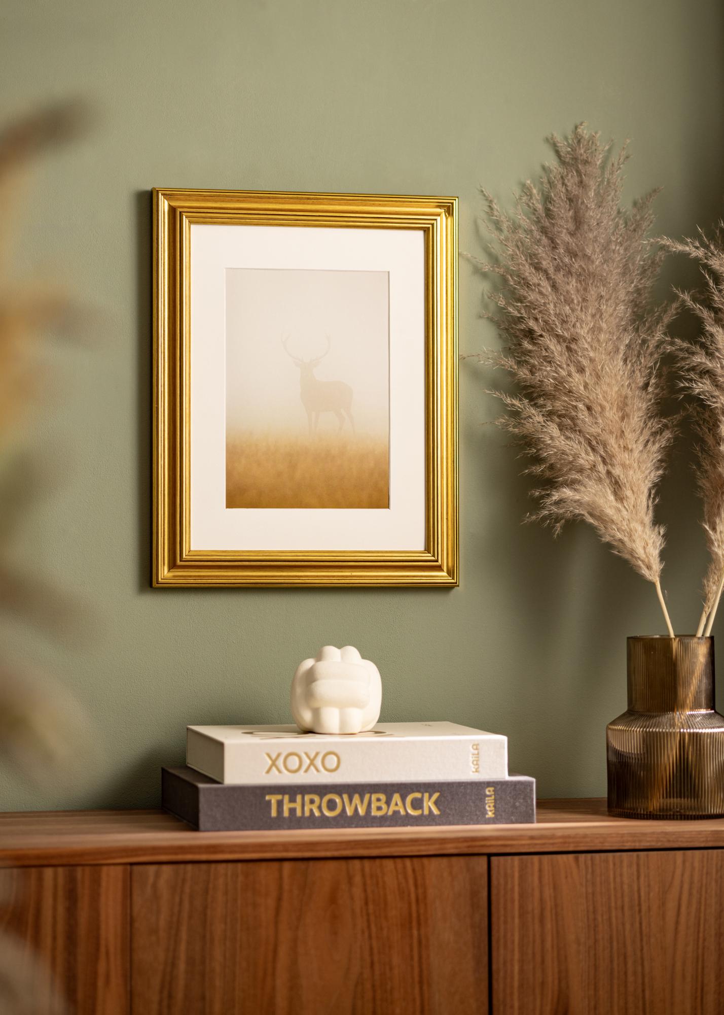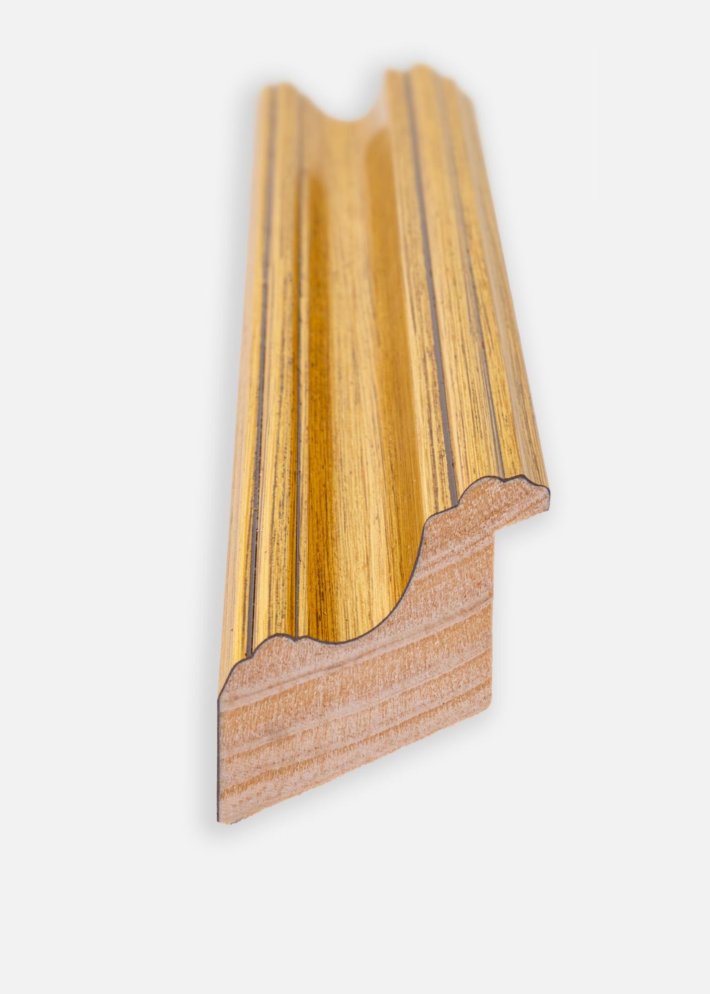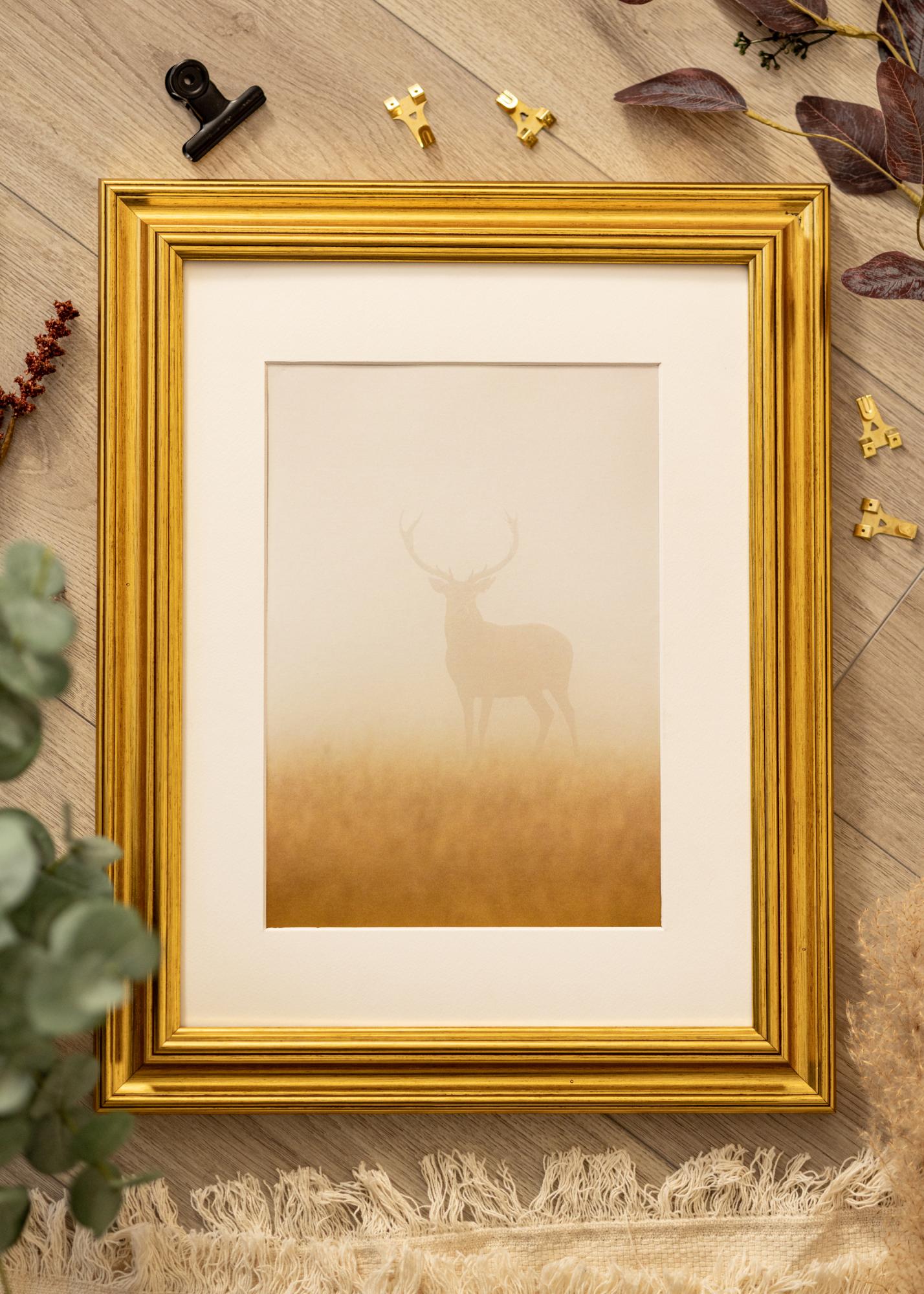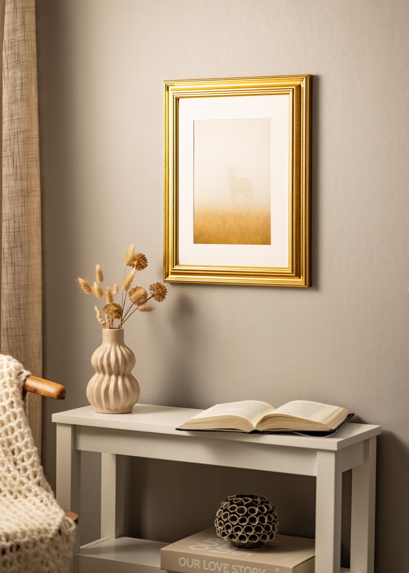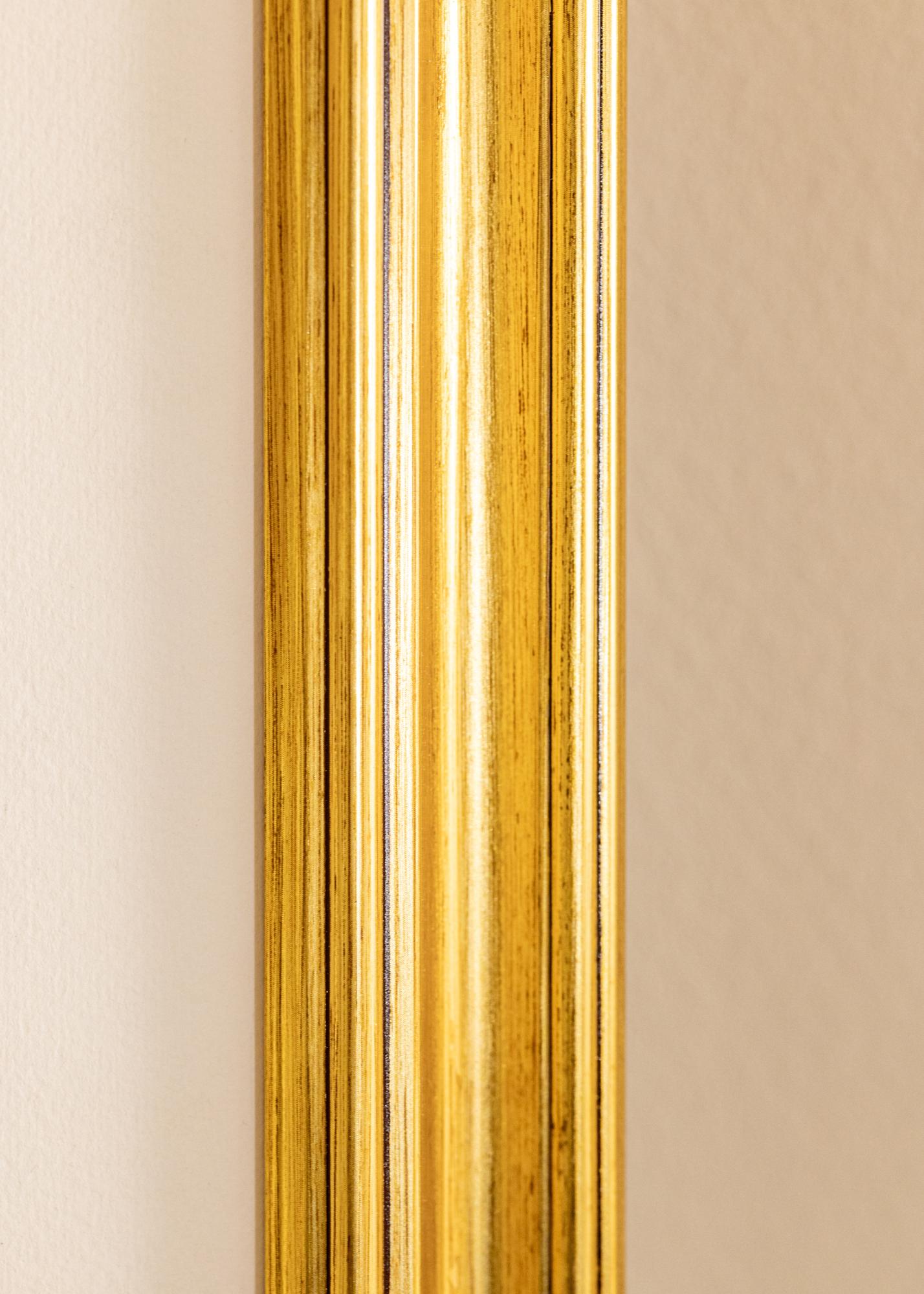 Cornice in legno dorato esclusiva, con un profilo classico e una sensazione dipinta a mano, che rende la cornice vivace e le conferisce un bell'aspetto lucente. Una cornice elegante per incorniciare paesaggi, ritratti e nature morte, o perché non usarla per creare un contrasto interessante con un poster graficamente semplice. Le cornici dorate si adattano sia a case arredate in stile antico che a loft urbani che desiderano un tocco elegante. Appendi più quadri con stili diversi su cornici dorate insieme per creare una parete di quadri.