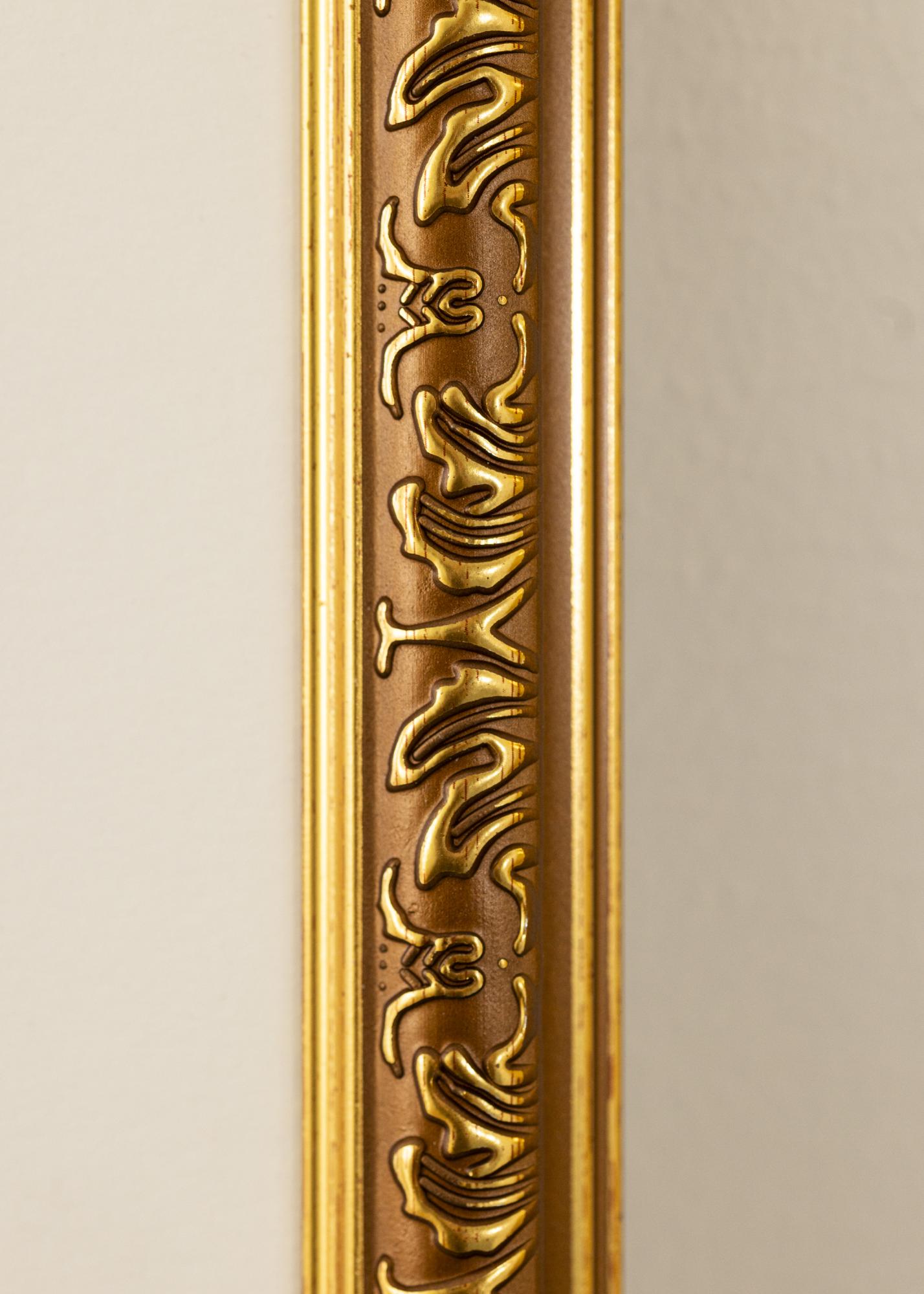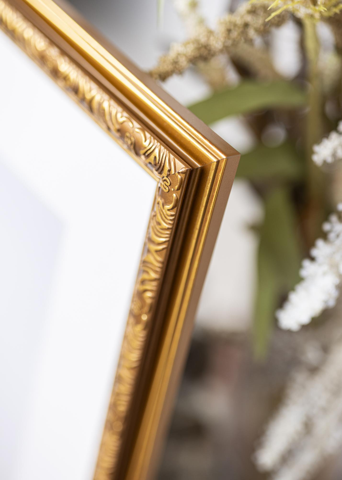 La cornice larga 28 mm in oro presenta dettagli decorativi e ornamenti che donano un senso tradizionale e senza tempo. I motivi intricati lungo il bordo interno ne accentuano l'aspetto sofisticato, rendendola ideale per stili di arredamento classici ed eleganti. Con una profondità di 20 mm, la cornice offre un inquadramento stabile e robusto per le tue immagini.