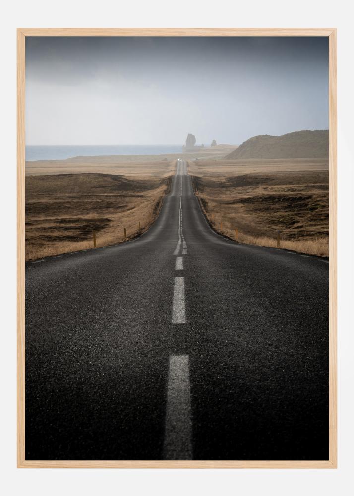 Un poster paesaggistico con una strada che si snoda lungo la campagna remota. Una strada asfaltata scompare all'orizzonte e le linee bianche delimitano il percorso. Lungo entrambi i lati ci sono campi marroni e si può vedere il mare e le colline in lontananza. Immagina dove questa strada potrebbe portarti quando questa immagine è appesa al muro.