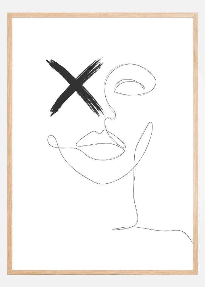 Un poster astratto con un volto disegnato con una sottile linea nera su uno sfondo bianco. La linea è unita in un movimento fluido per disegnare il volto. Sopra un occhio è disegnata una grande croce nera. Appenderlo su una parete colorata per ottenere un argomento di conversazione interessante.