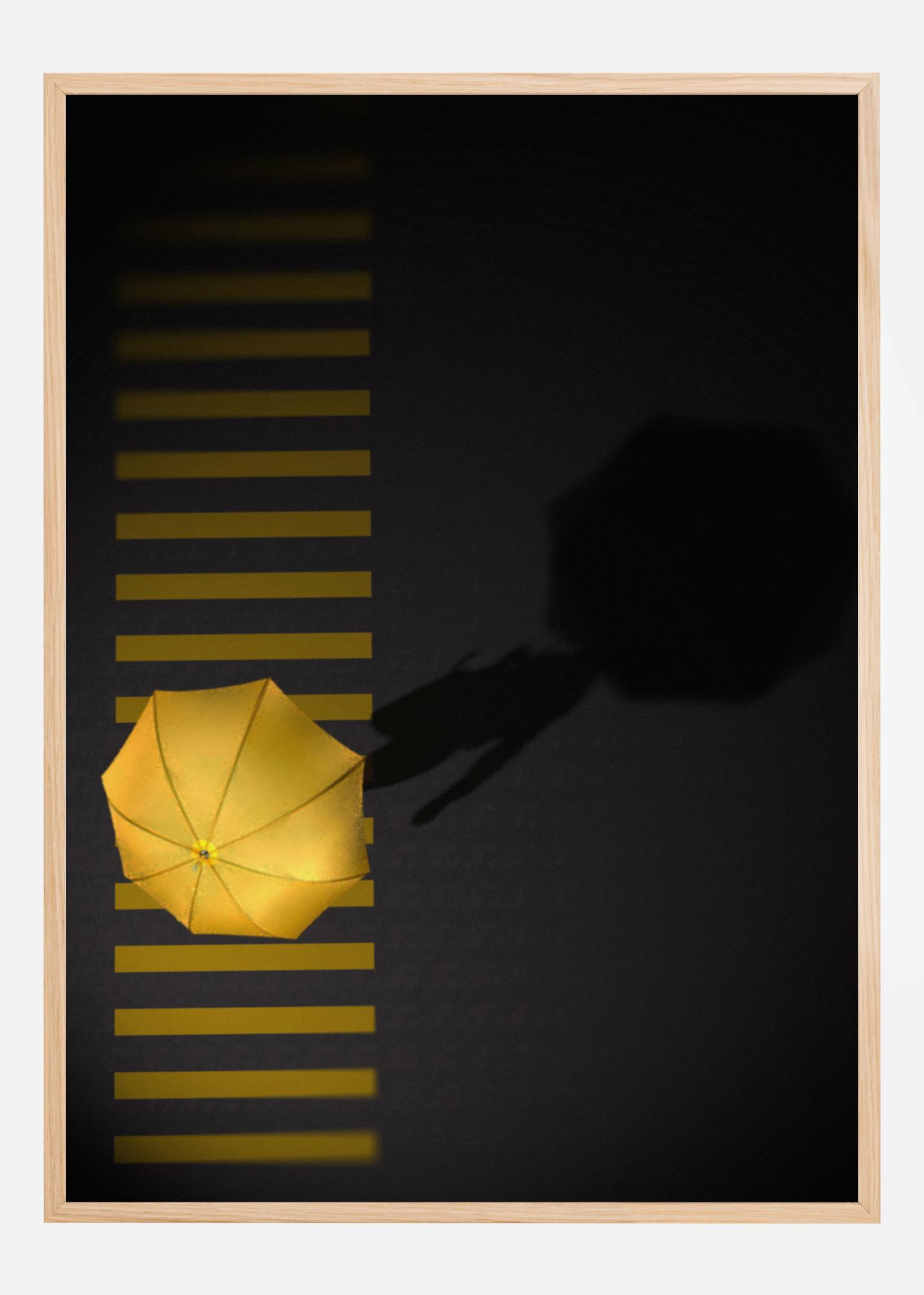 Un'immagine aerea di un pedone con un ombrello giallo su una striscia pedonale. Le linee giallo chiaro della striscia pedonale sono divise dall'ombrello giallo vivace. L'ombra del pedone aggiunge ulteriore drammaticità all'immagine e rende l'opera un perfetto dettaglio d'arredo.