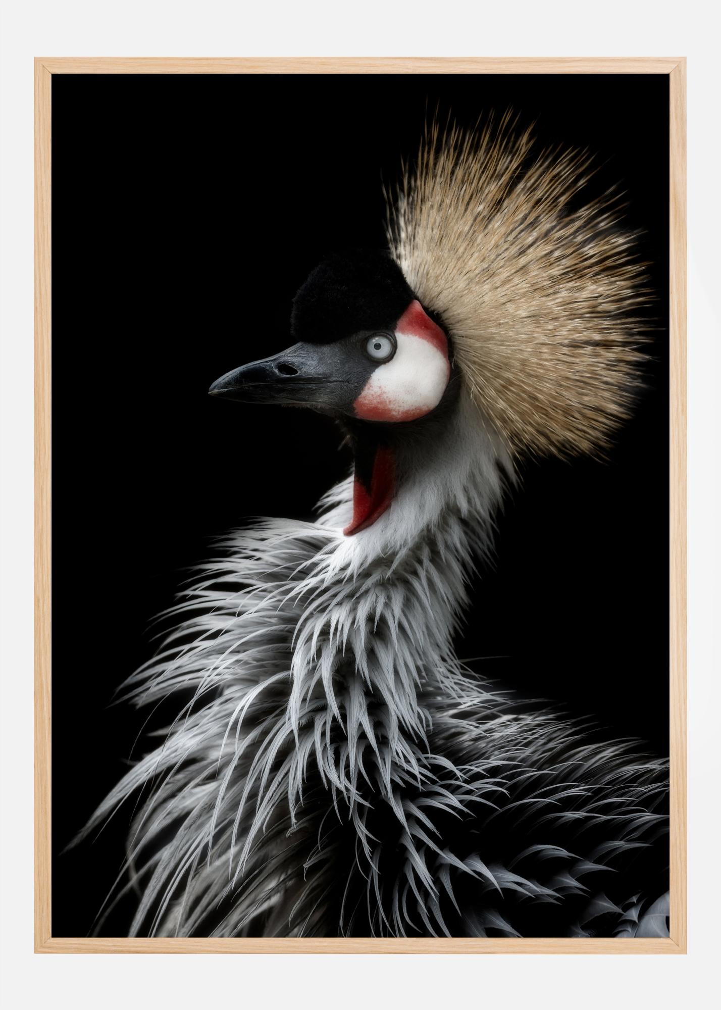 Un fantastico poster di una natura selvaggia con una gru su uno sfondo nero. Le piume bianche e la cresta gialla soffice spiccano in modo drammatico e creano un effetto regale. I motivi rossi e bianchi attirano l'attenzione verso l'occhio dell'uccello. Ammira quanto magnifica sia la natura grazie a questo fantastico ritratto di uccello.