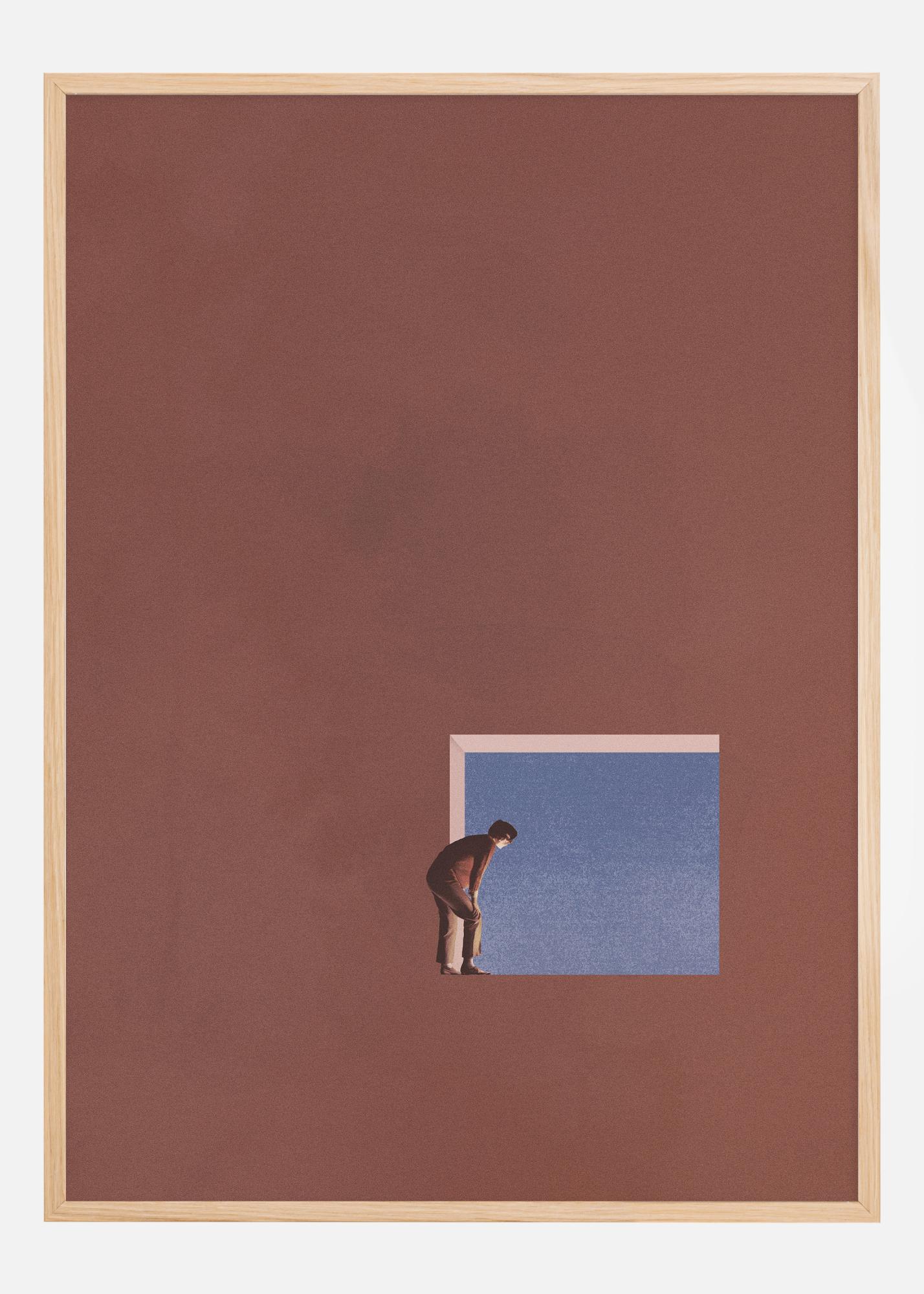Questo poster suggestivo e concettuale cattura una singola persona che si sporge in avanti, guardando attraverso un'apertura quadrata in uno spazio blu che interrompe la superficie marrone circostante. Questa immagine semplice ma potente può essere vista come una rappresentazione della curiosità e del desiderio umano di esplorare e scoprire l'ignoto. Può anche essere una metafora per le finestre delle opportunità e l'importanza di cogliere l'occasione quando si presenta.