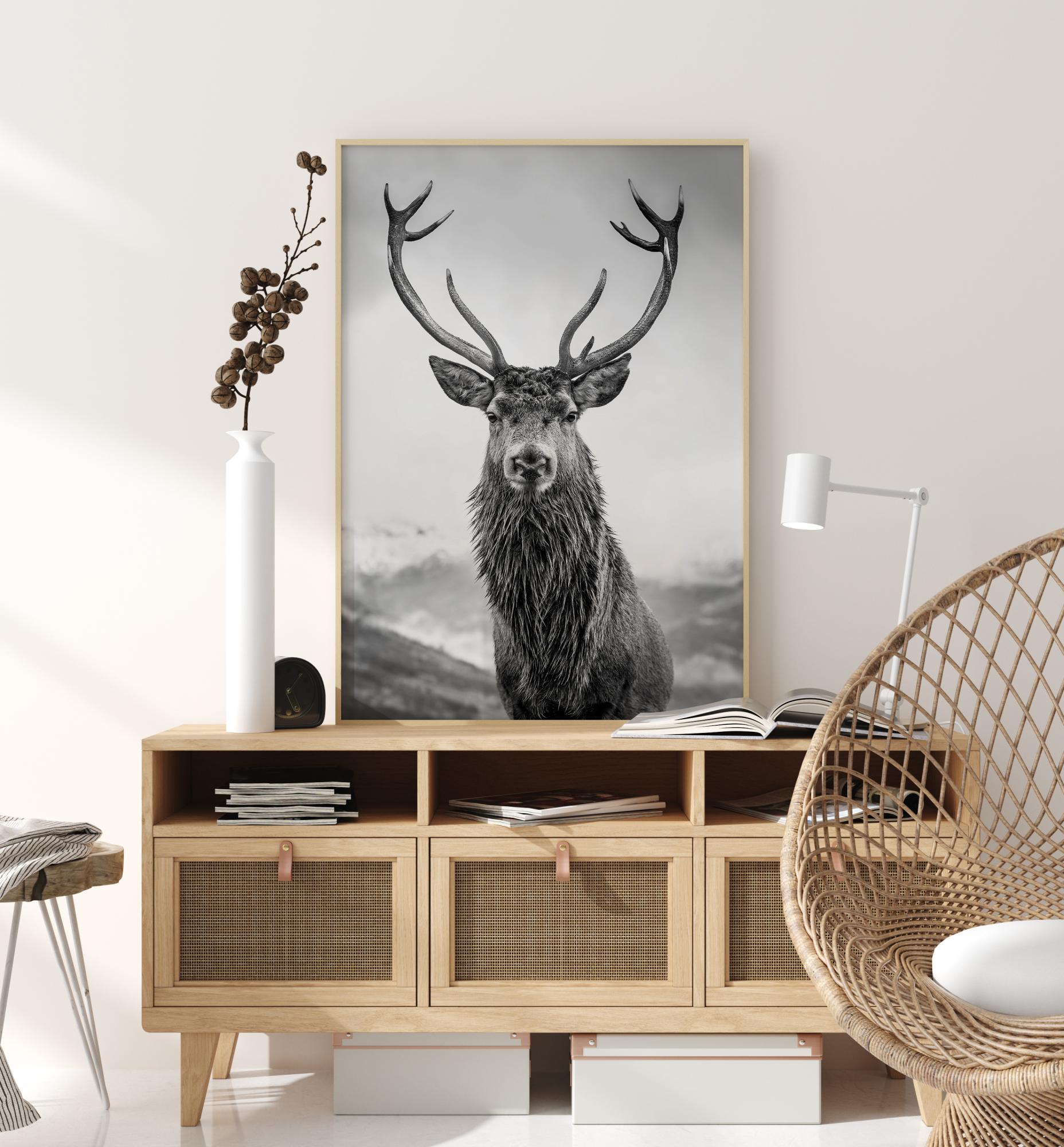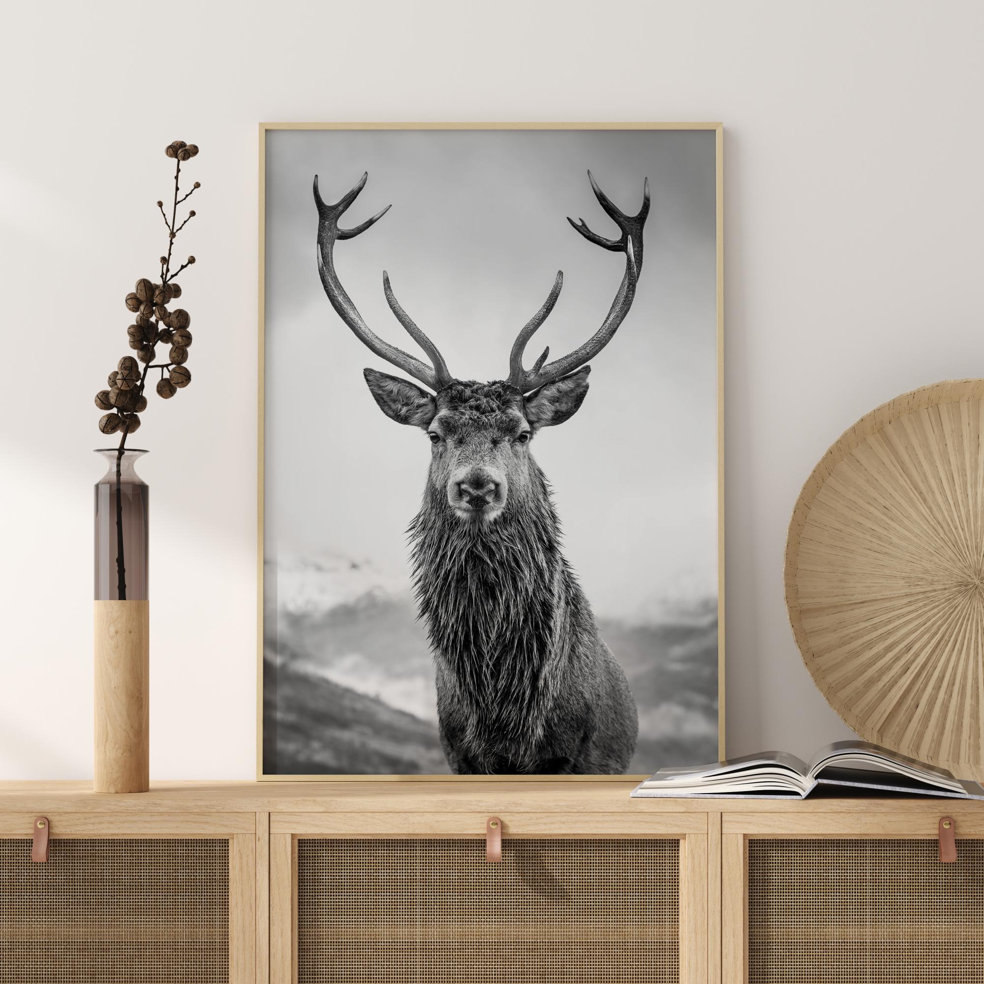 Un poster con un cervo rosso. Il cervo curioso guarda direttamente verso la telecamera con le sue corna che si ramificano drammaticamente nel cielo nuvoloso. Sullo sfondo ci sono colline ondulate. Questa stampa in bianco e nero prende davvero vita su una parete verde o blu.